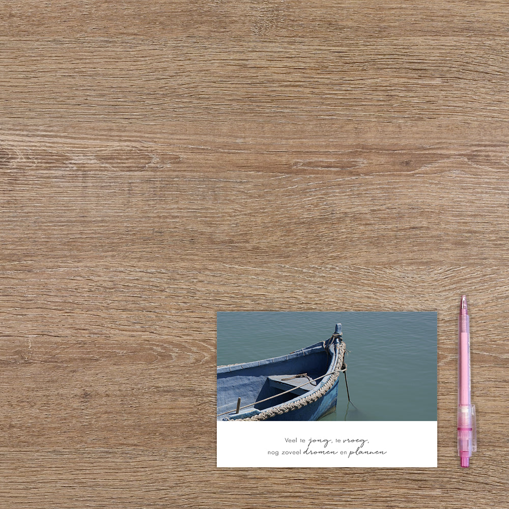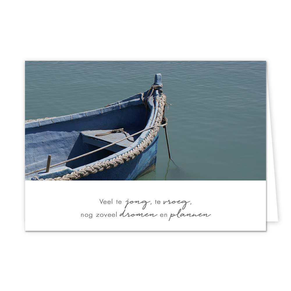 De wenskaart heeft een afmeting van x en een liggende vorm. Op deze wenskaart staat een boot die op het water drijft met daaronder de tekst: "Veel te jong, te vroeg, nog zoveel dromen en plannen". De binnenzijde van de wenskaart is bedrukt met de tekst "Woorden schieten te kort... veel kracht gewenst".