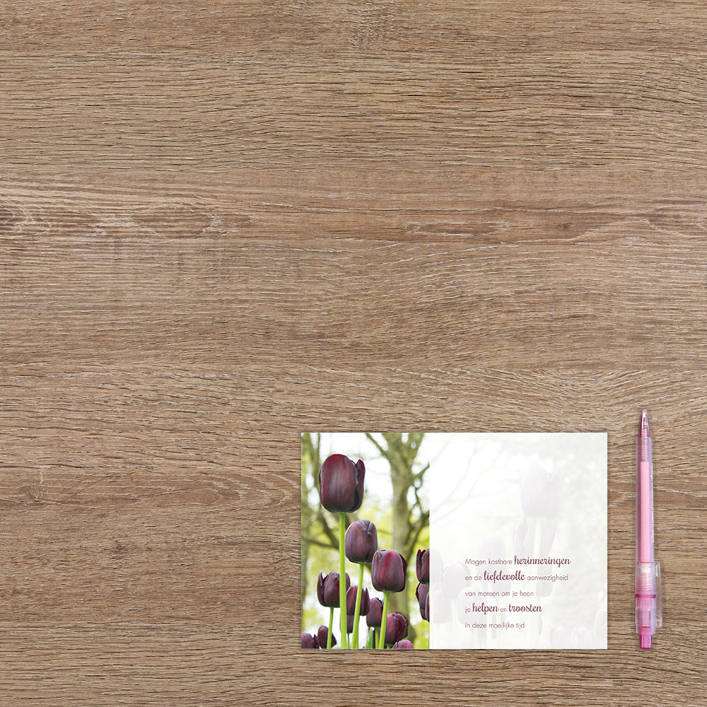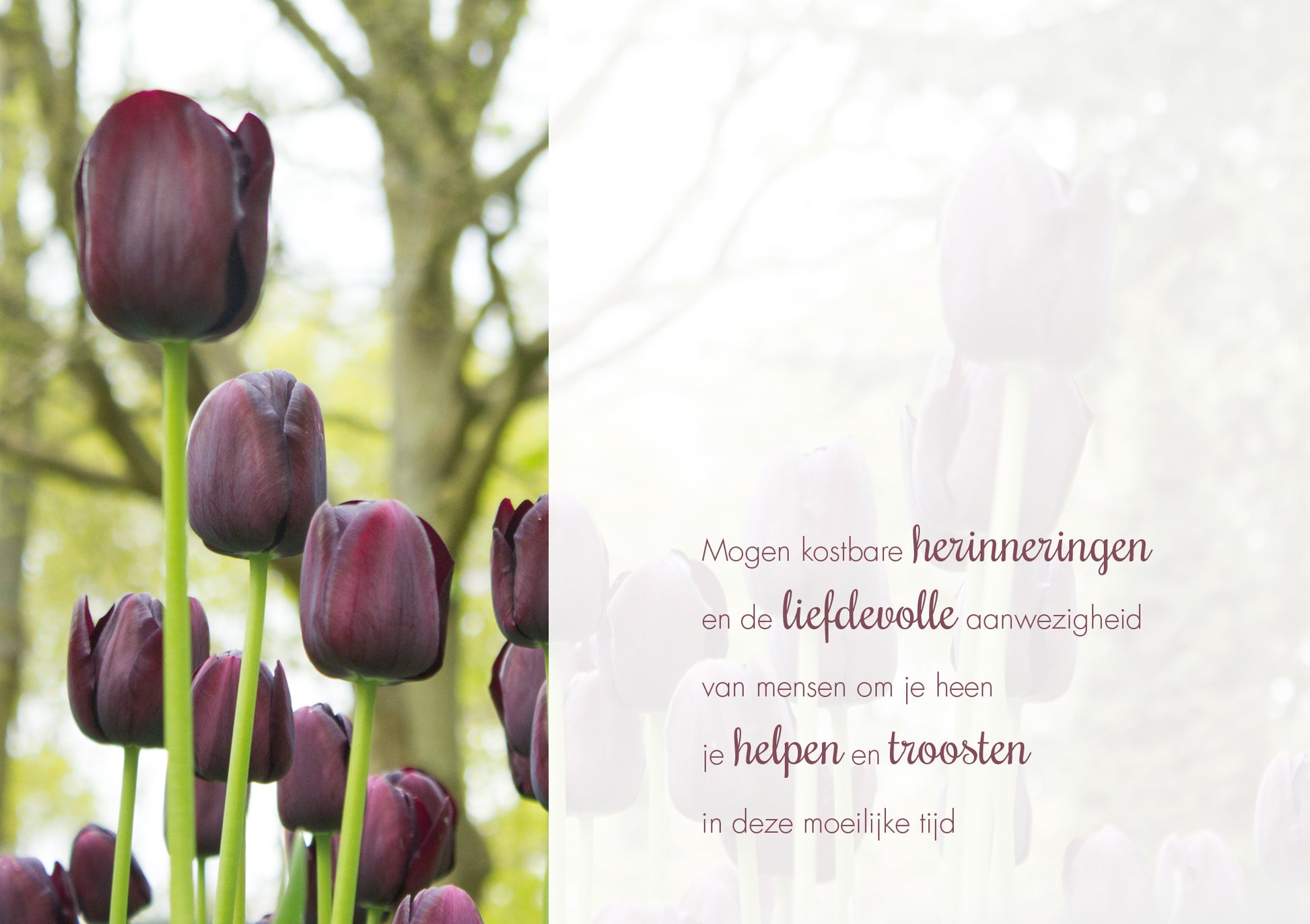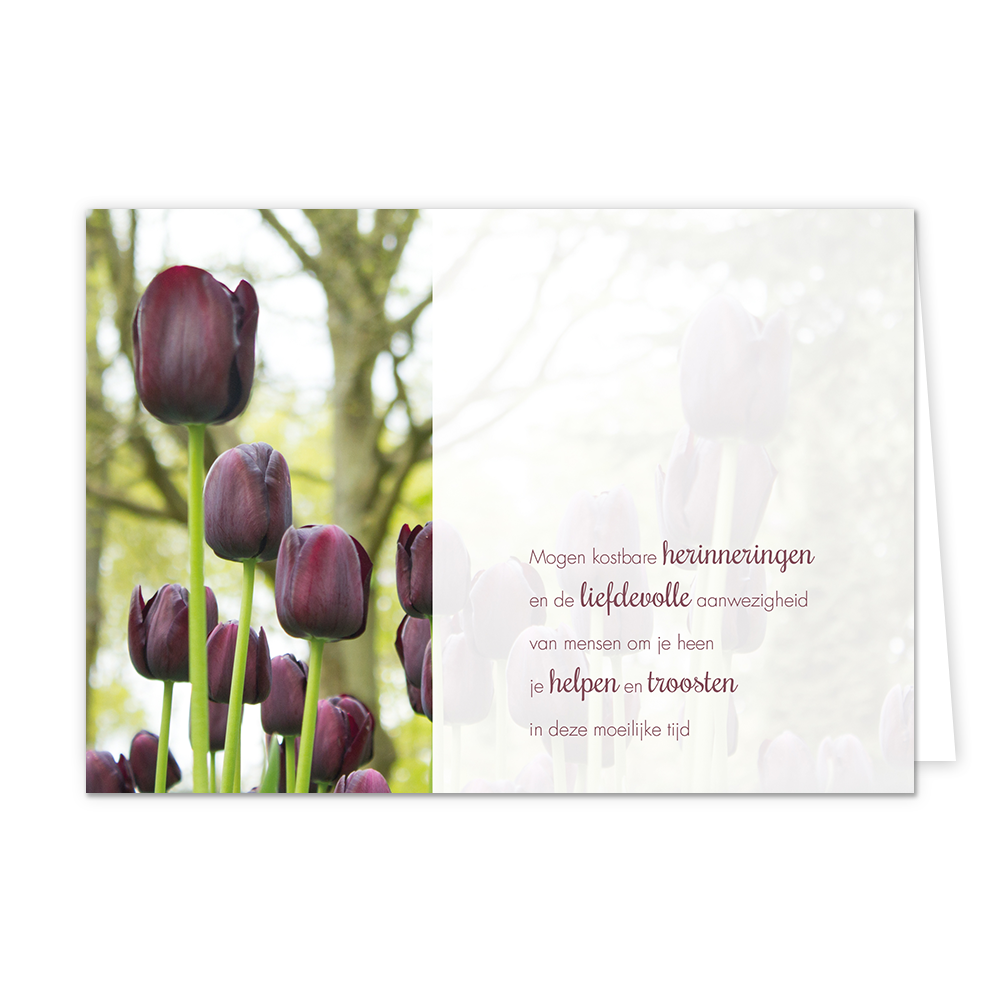 De wenskaart heeft een afmeting van x en een liggende vorm. Op deze wenskaart staan paarse tulpen met rechts de tekst: "Mogen kostbare herinneringen en de liefdevolle aanwezigheid van mensen om je heen je helpen en troosten in deze moeilijke tijd". De binnenzijde van de wenskaart is bedrukt met de tekst "Veel sterkte gewenst".