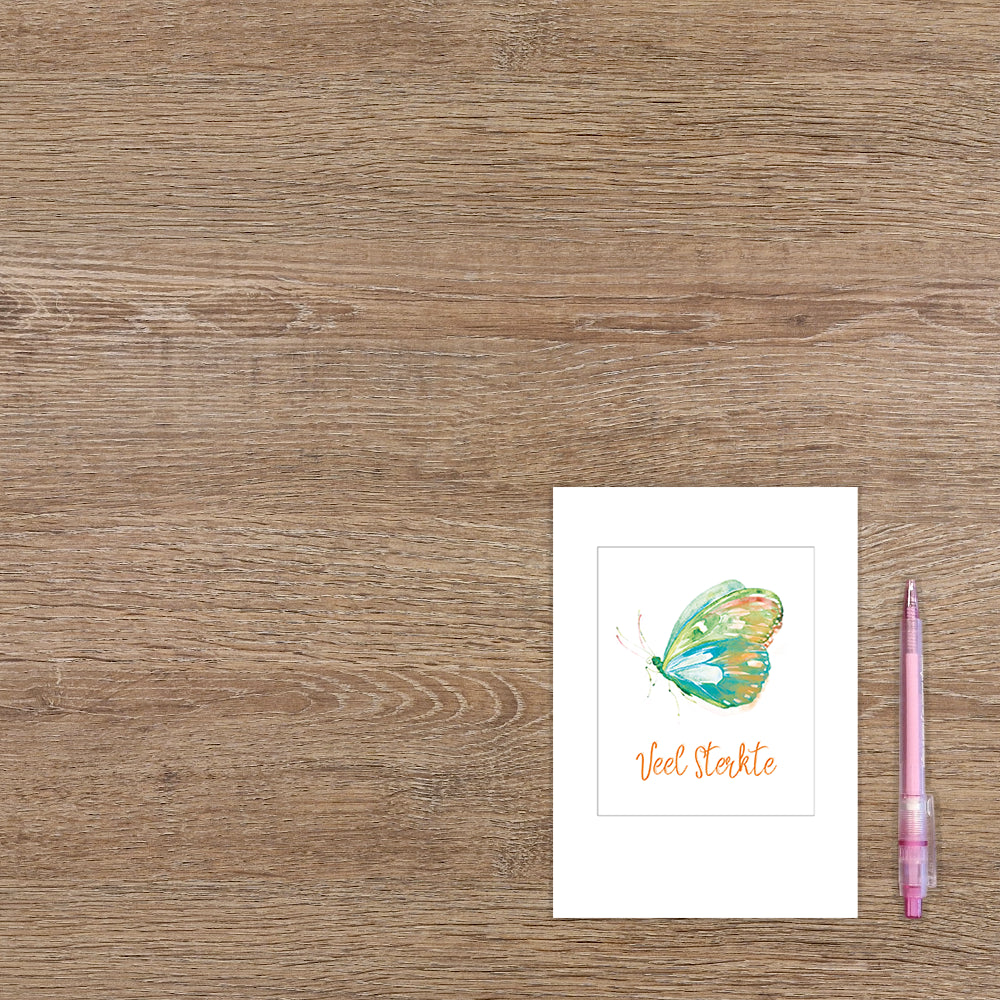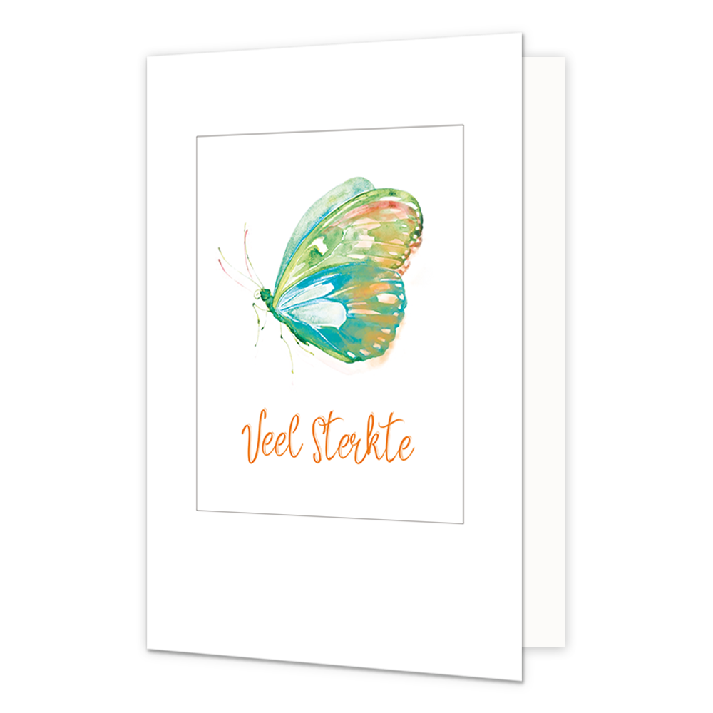 De wenskaart heeft een afmeting van x en een liggende vorm. Op deze wenskaart staat een vlinder met daaronder de tekst: "Veel sterkte" De binnenzijde van de wenskaart is blanco wat voldoende ruimte geeft om een persoonlijke boodschap te schrijven .