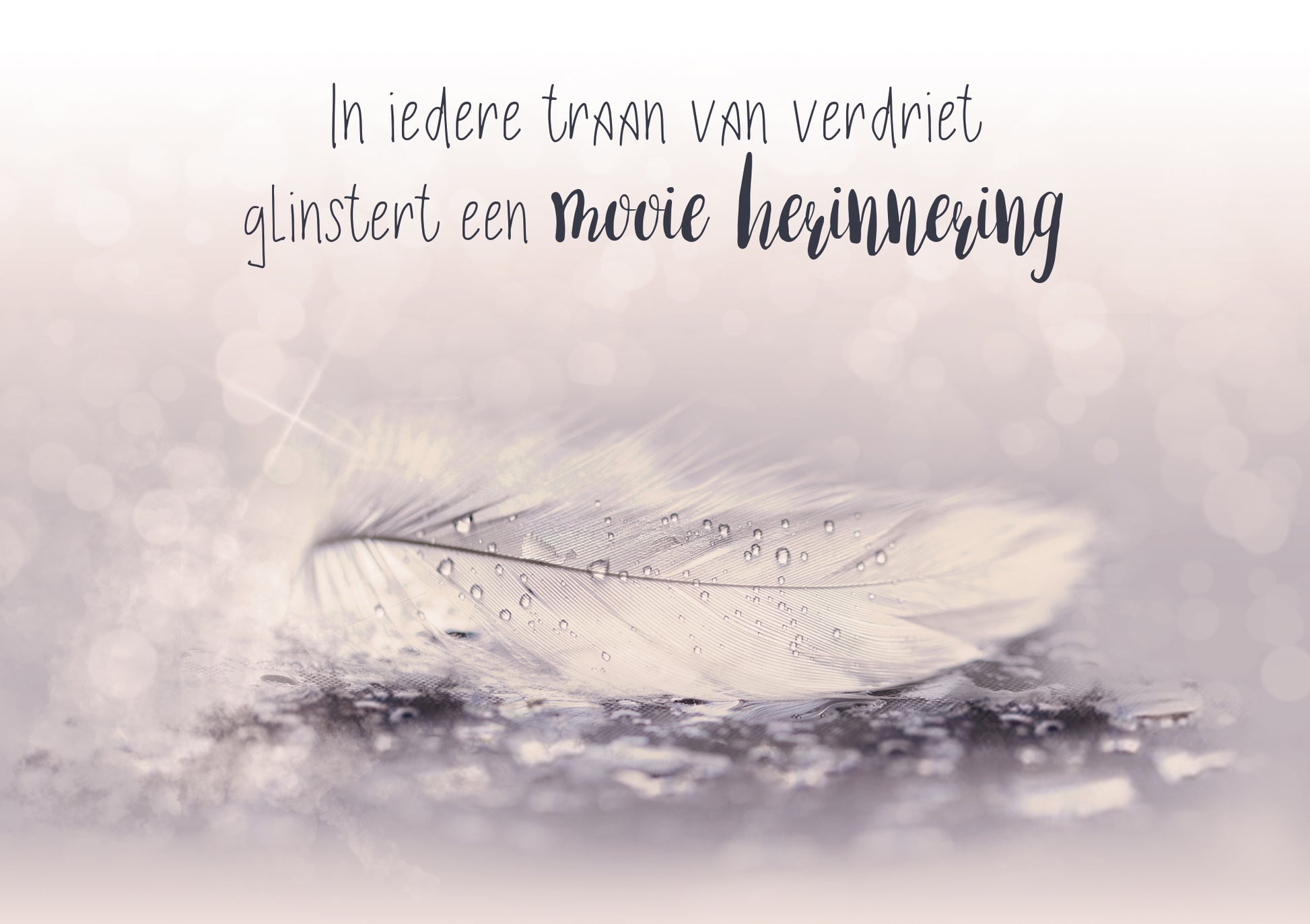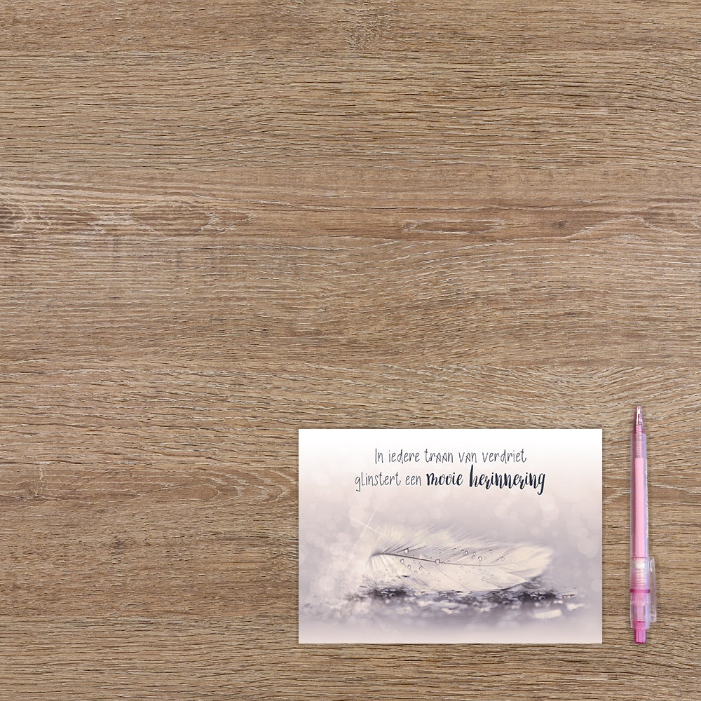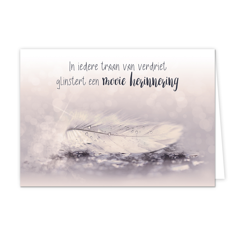De wenskaart heeft een afmeting van x en een liggende vorm. Op deze wenskaart staat een veer met daarboven de tekst: "In iedere traan van verdriet glinstert een mooie herinnering". De binnenzijde van de wenskaart is bedrukt met de tekst "Veel sterkte met dit verlies".
