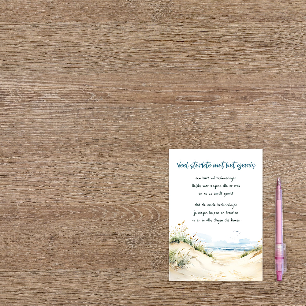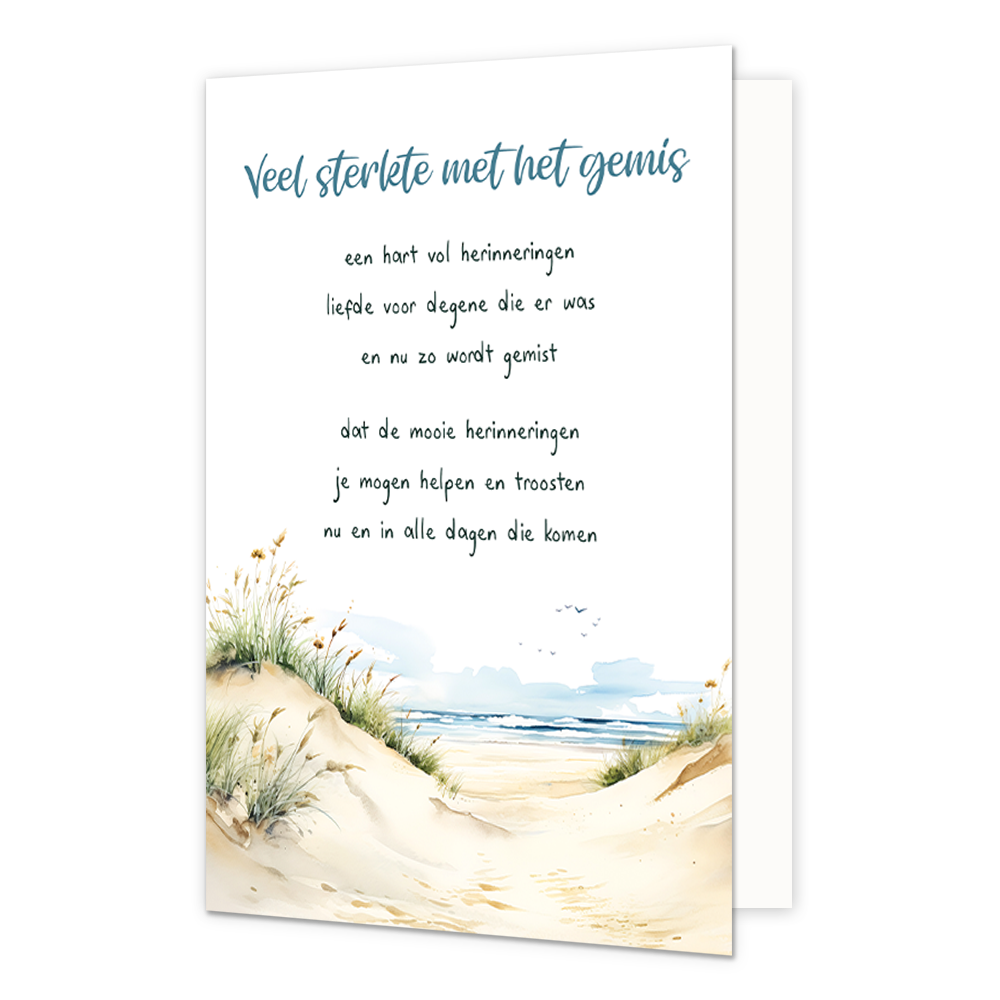 De wenskaart heeft een afmeting van x en een staande vorm. Op deze wenskaart is een strand te zien met duinen waardoor je ze zee ziet. Bovenaan staat de tekst: "Veel sterkte met het gemis. Een hart vol herinneringen, liefde voor degene die er was en nu zo wordt gemist. Dat de mooie herinneringen je mogen helpen en troosten nu en in alle dagen die komen". De binnenzijde van de wenskaart is blanco wat voldoende ruimte geeft om een persoonlijke boodschap te schrijven .