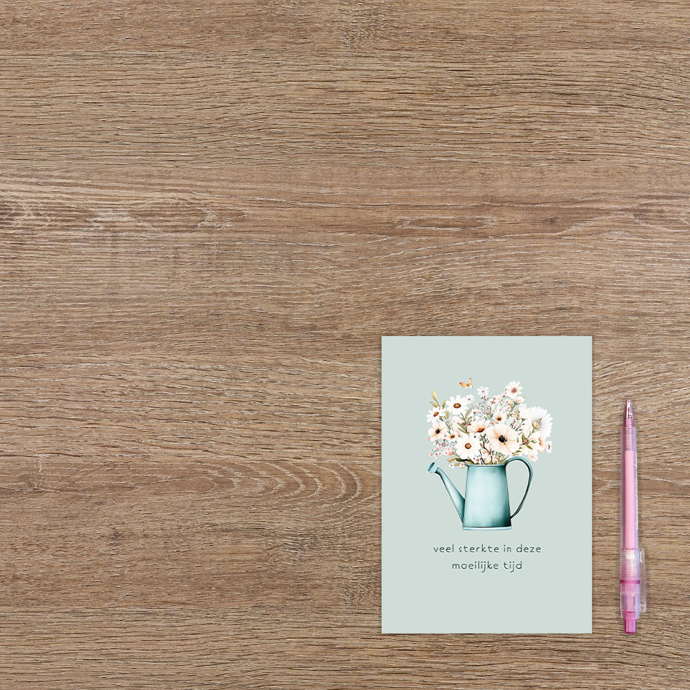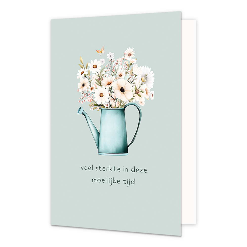 De wenskaart heeft een afmeting van x en een staande vorm. Op deze wenskaart staat een gieter met witte bloemen. Daaronder staat de tekst: "Veel sterkte in deze moeilijke tijd". De binnenzijde van de wenskaart is blanco wat voldoende ruimte geeft om een persoonlijke boodschap te schrijven .