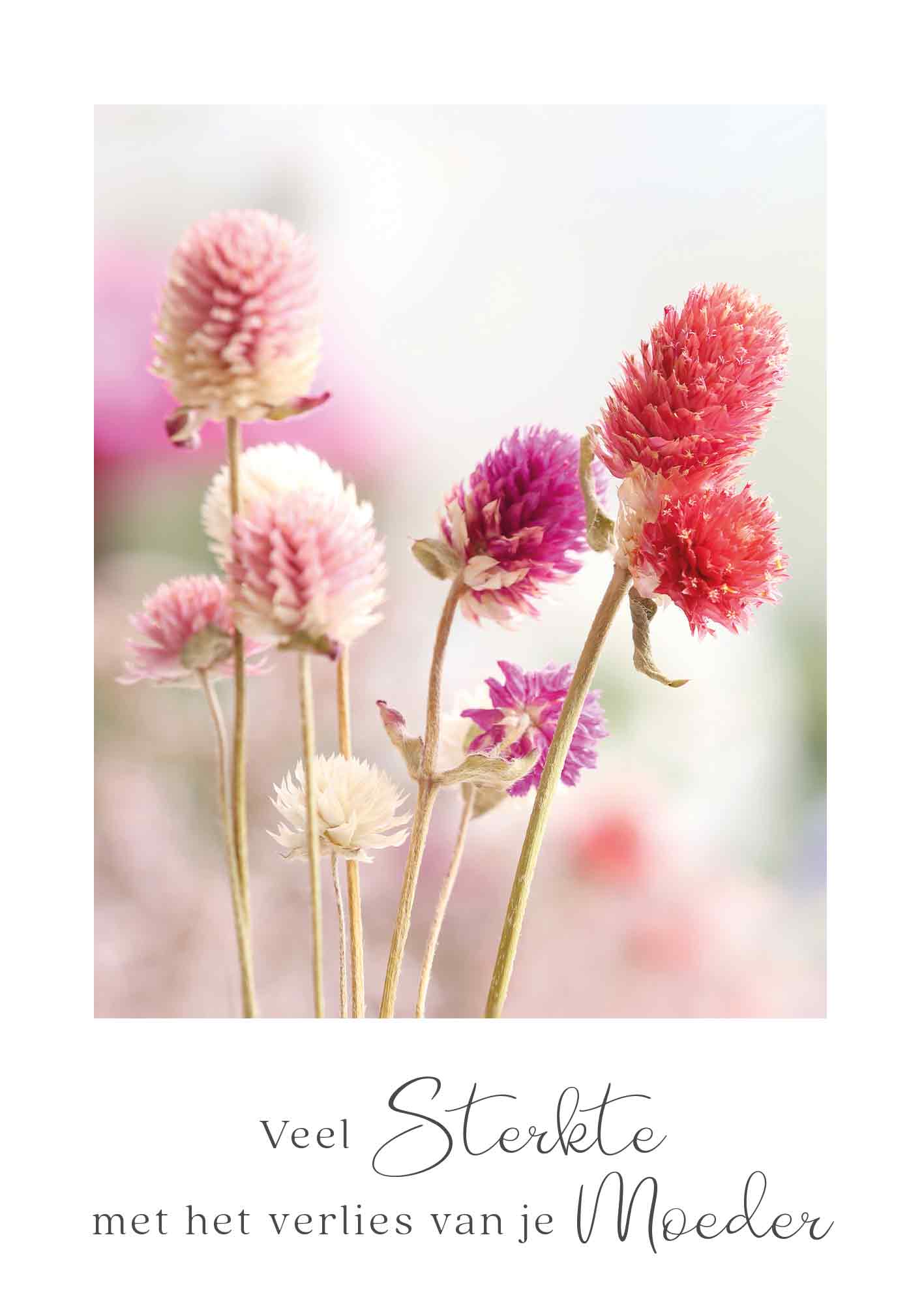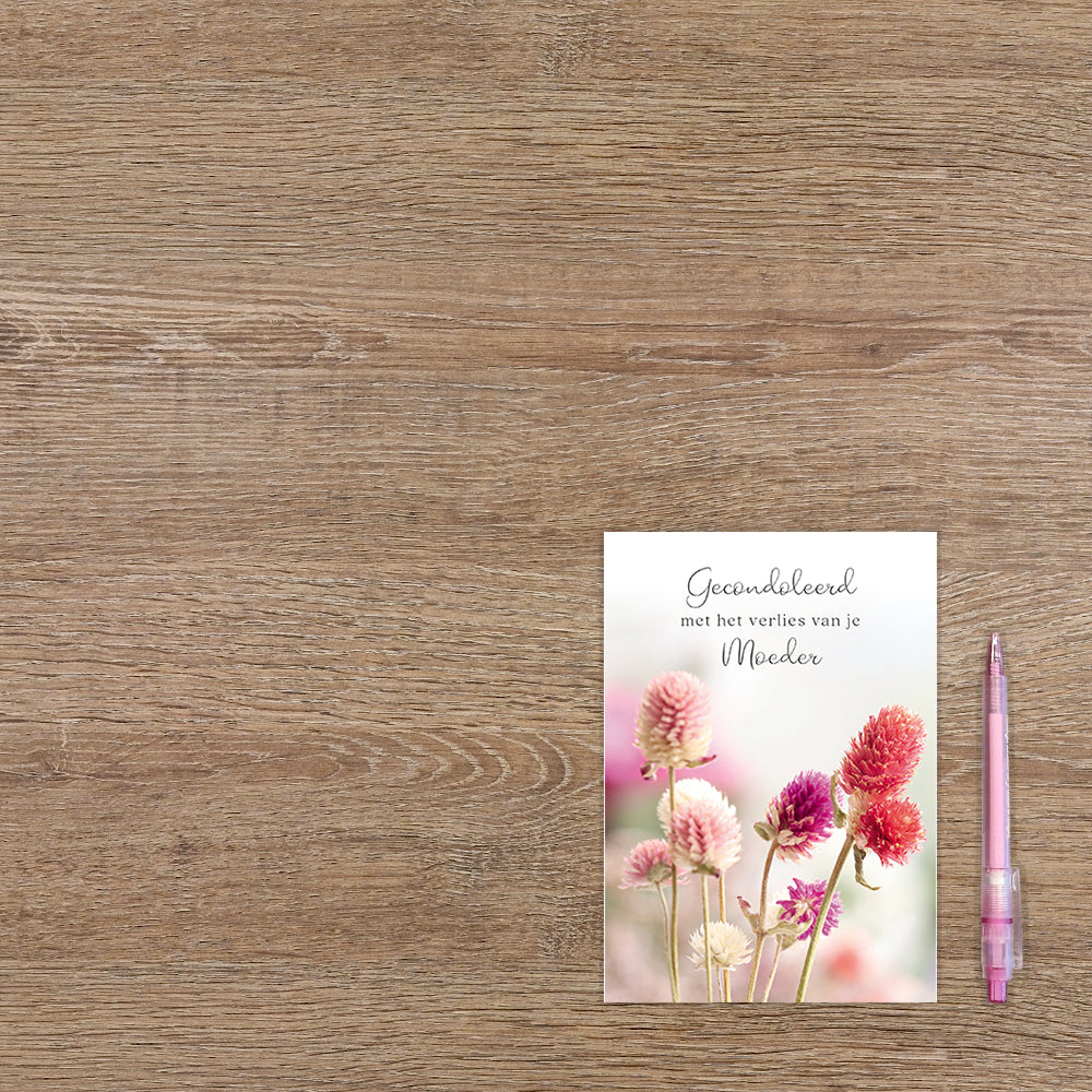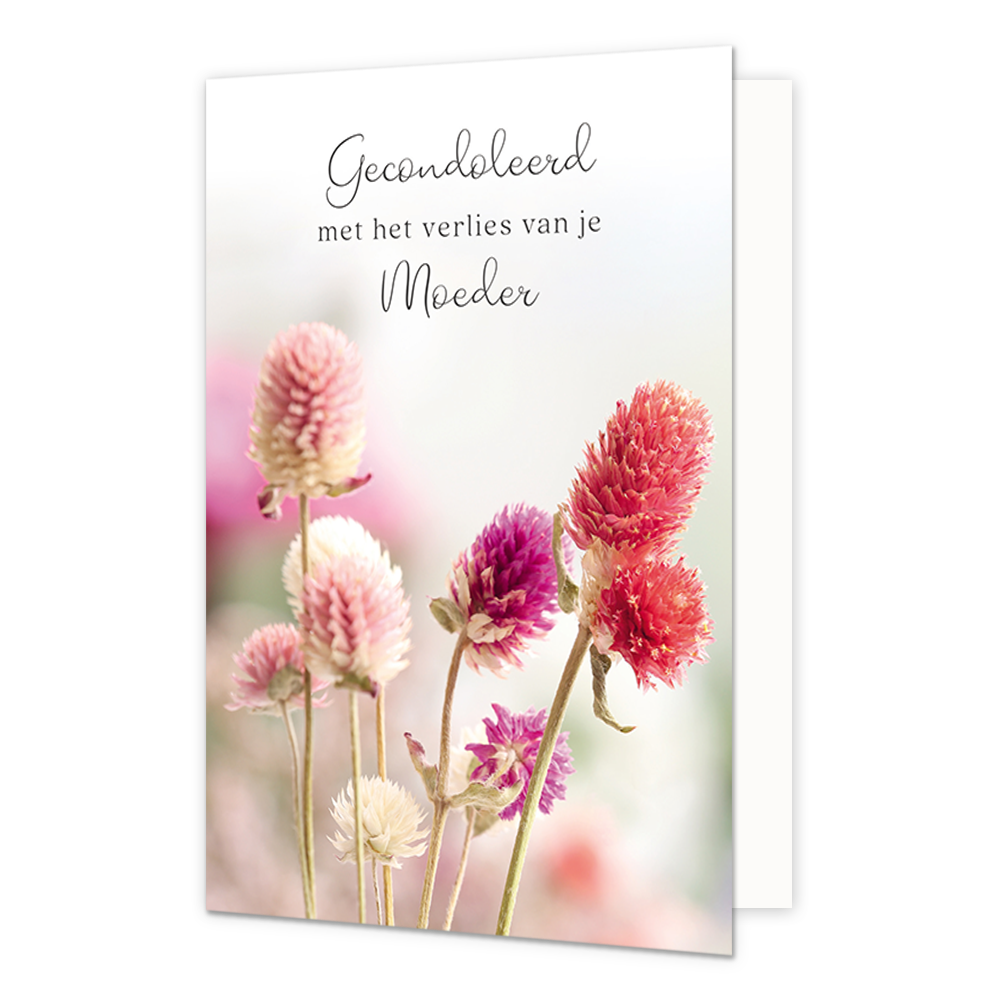 De wenskaart heeft een afmeting van x en een staande vorm. Op deze wenskaart staan bloemen in de kluren paars, rood en roze. Onder de illustratie staat de tekst: "Veel sterkte met het verlies van je moeder". De binnenzijde van de wenskaart is bedrukt met de tekst "Een lege plek, een groot gemis. Veel sterkte".
