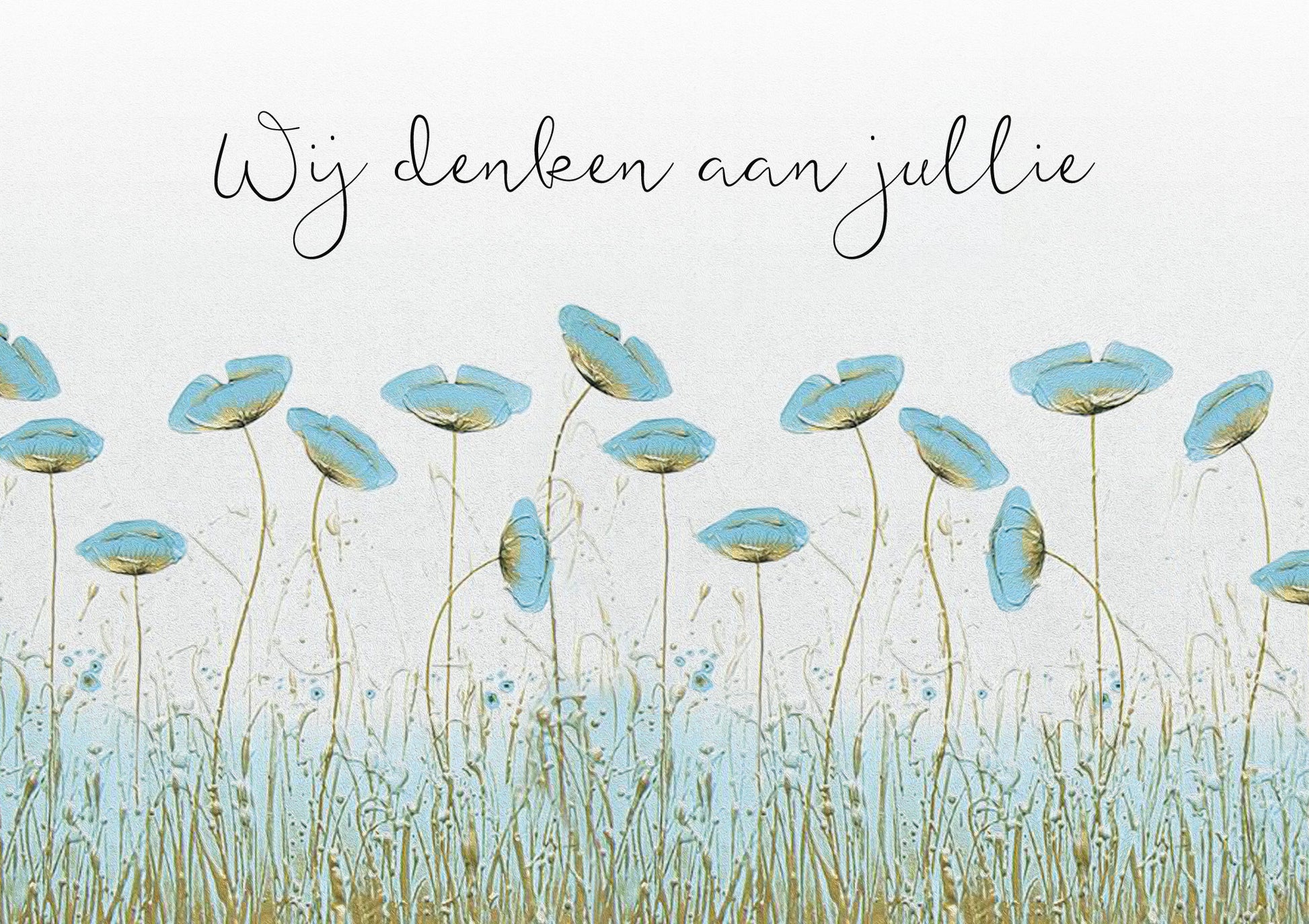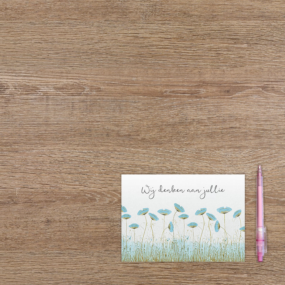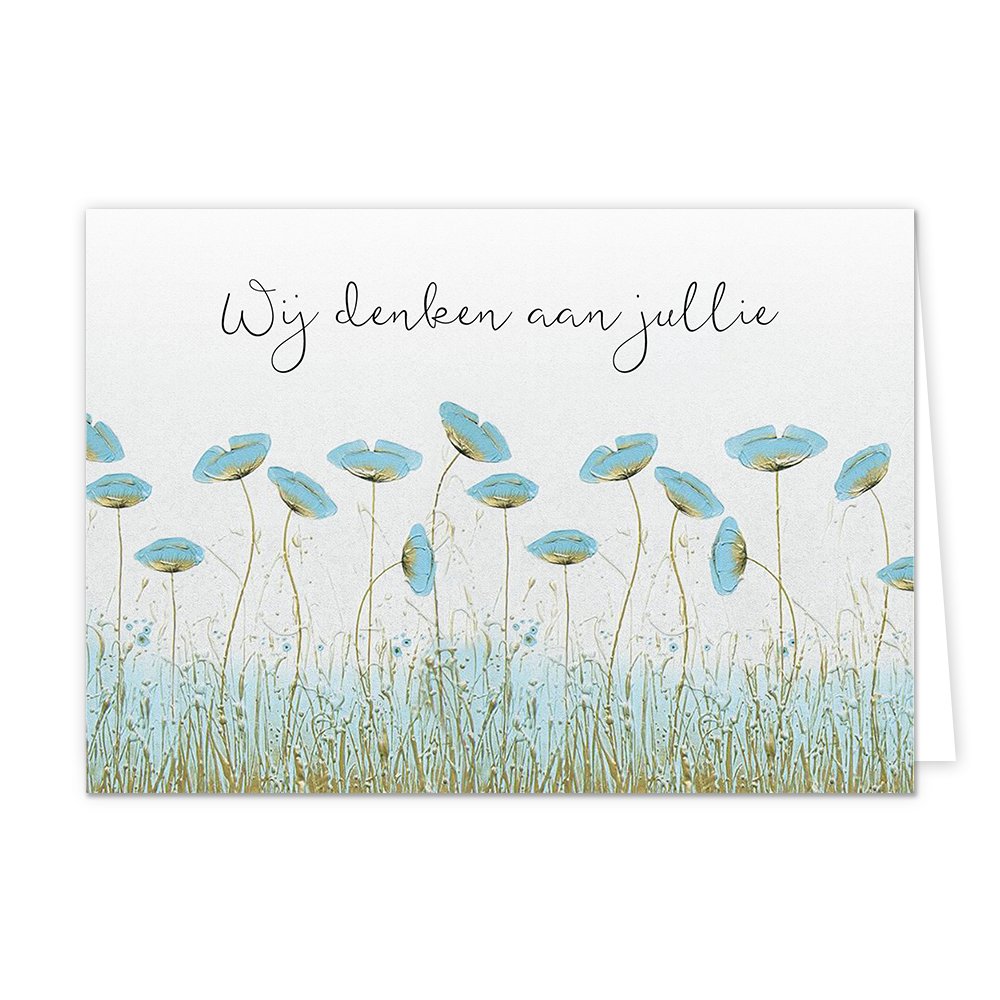 De wenskaart heeft een afmeting van x en een liggende vorm. Op deze wenskaart staat een bloemenveld met blauwe bloemen en daarboven de tekst: "Wij denken aan jullie". De binnenzijde van de wenskaart is blanco wat voldoende ruimte geeft om een persoonlijke boodschap te schrijven .