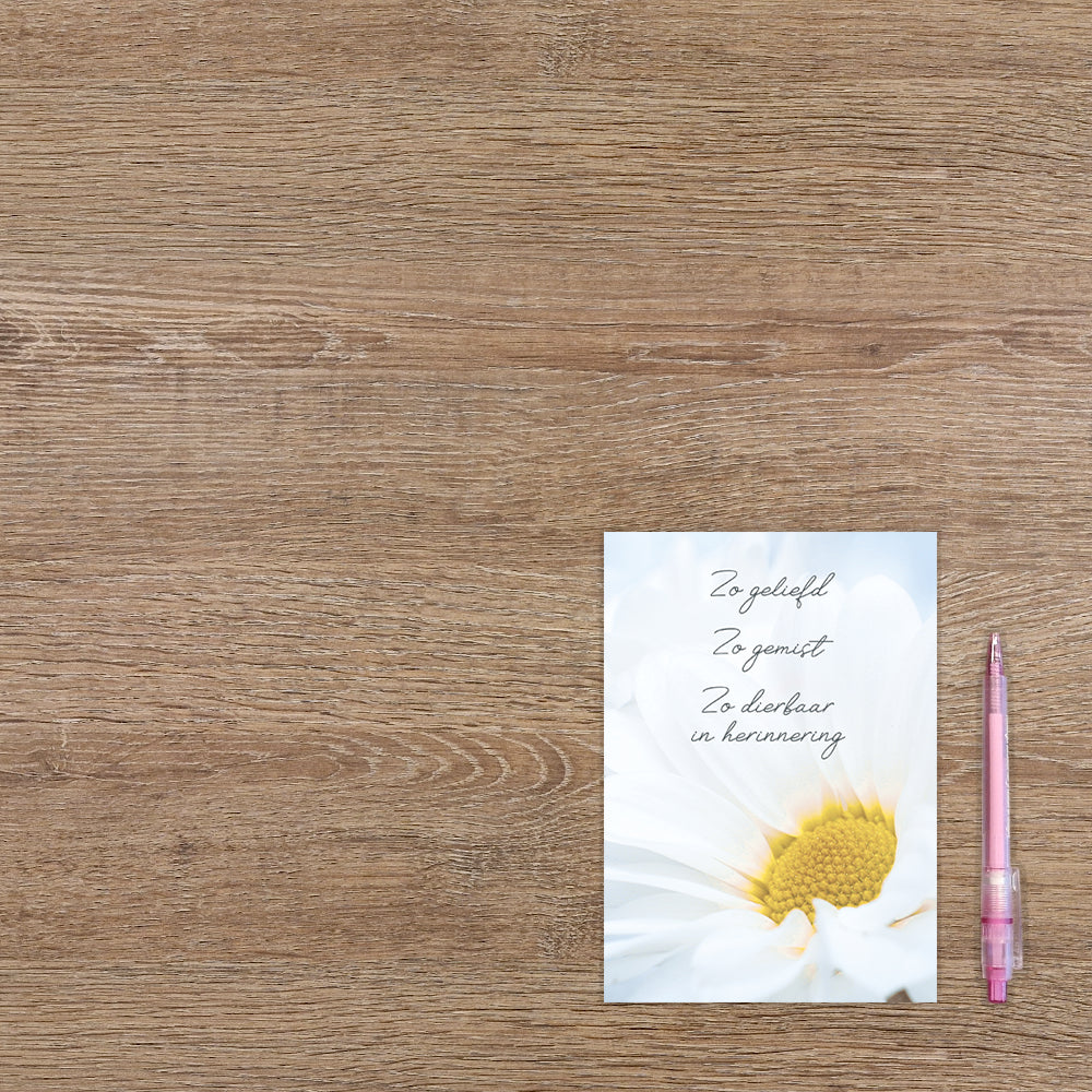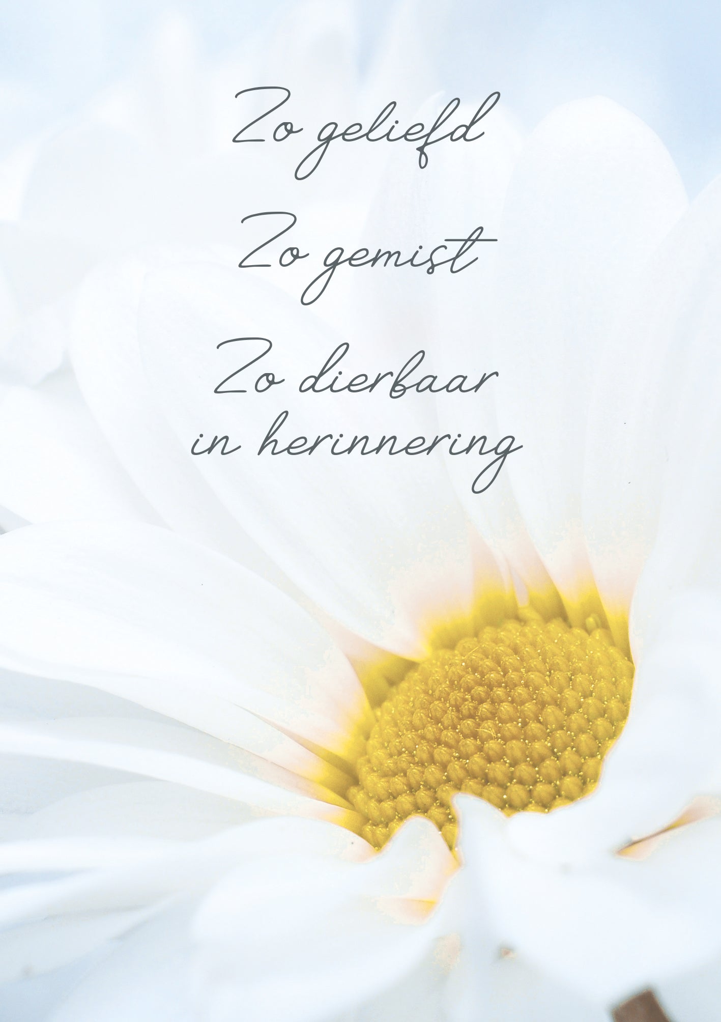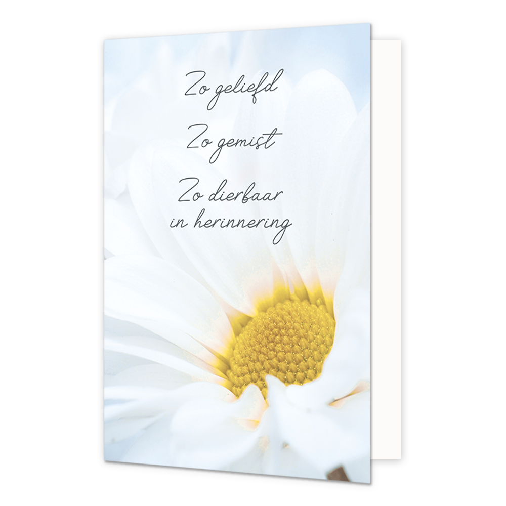 De wenskaart heeft een afmeting van x en een staande vorm. Op deze wenskaart staat een witte bloem met de tekst: "Zo geliefd Zo gemist Zo dierbaar in herinnering". De binnenzijde van de wenskaart is bedrukt met de tekst "Veel sterkte met dit verlies".