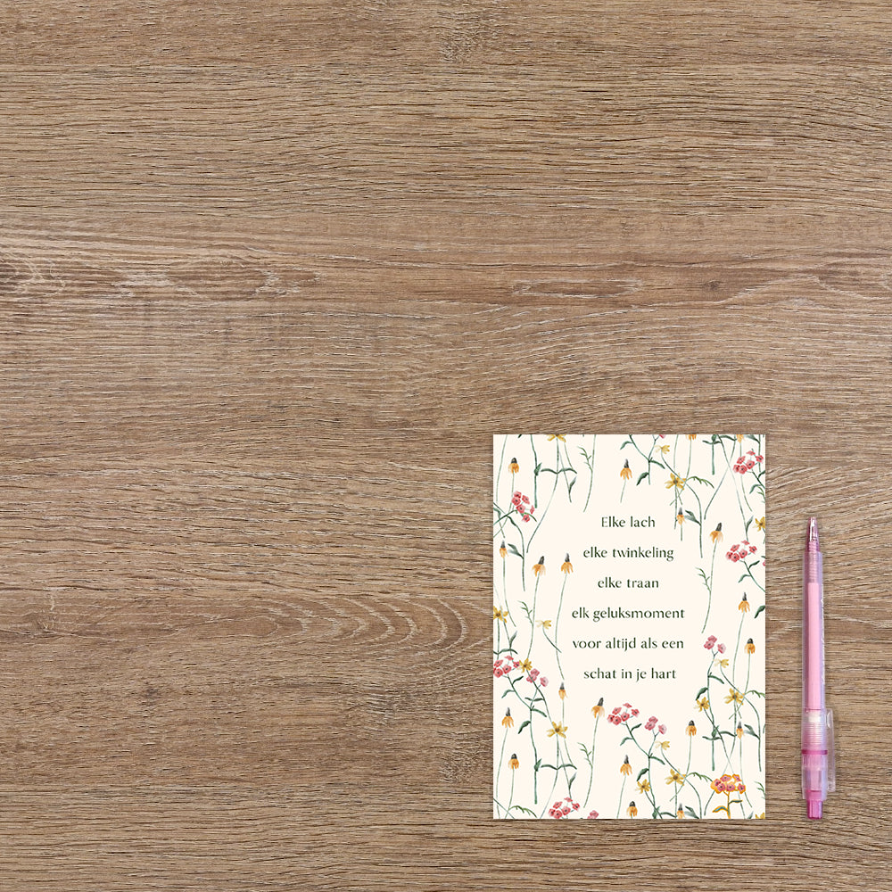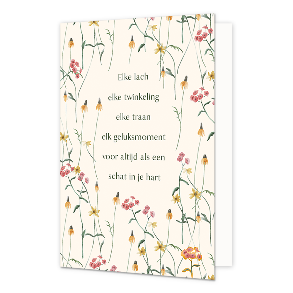 De wenskaart heeft een afmeting van x en een staande vorm. Op deze wenskaart staan bloemen in de kleuren roze, geel en oranje met in het midden de tekst: "Elke lach, elke twinkeling, elke traan, elk gelukstmoment voor altijd als een schat in je hart". De binnenzijde van de wenskaart is bedrukt met de tekst "Heel veel sterkte met dit verlies".