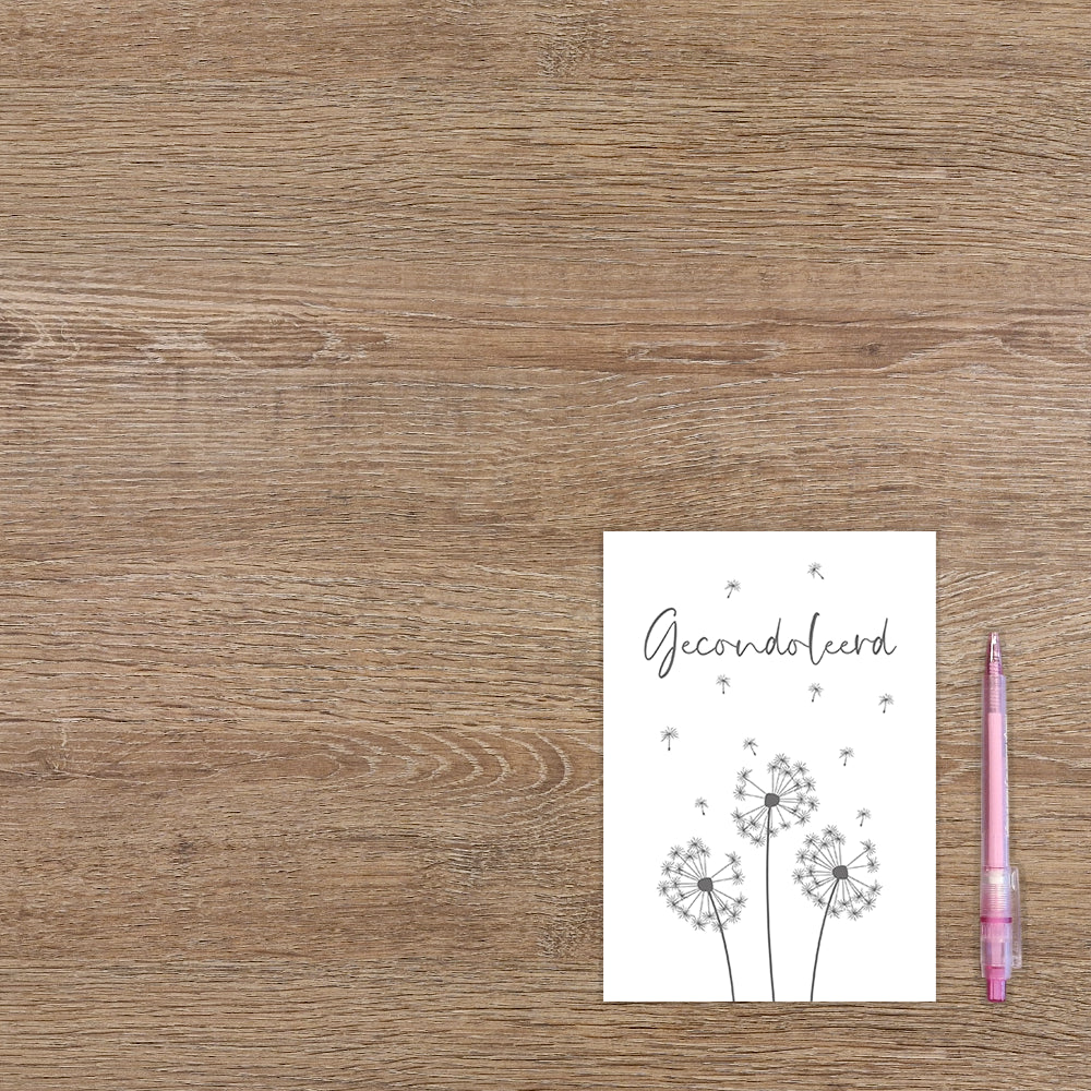 De wenskaart heeft een afmeting van x en een staande vorm. Op deze wenskaart staan drie grijze paardenbloemen met daarboven de tekst: "Gecondoleerd". De binnenzijde van de wenskaart is bedrukt met de tekst "Veel sterkte met dit verlies".