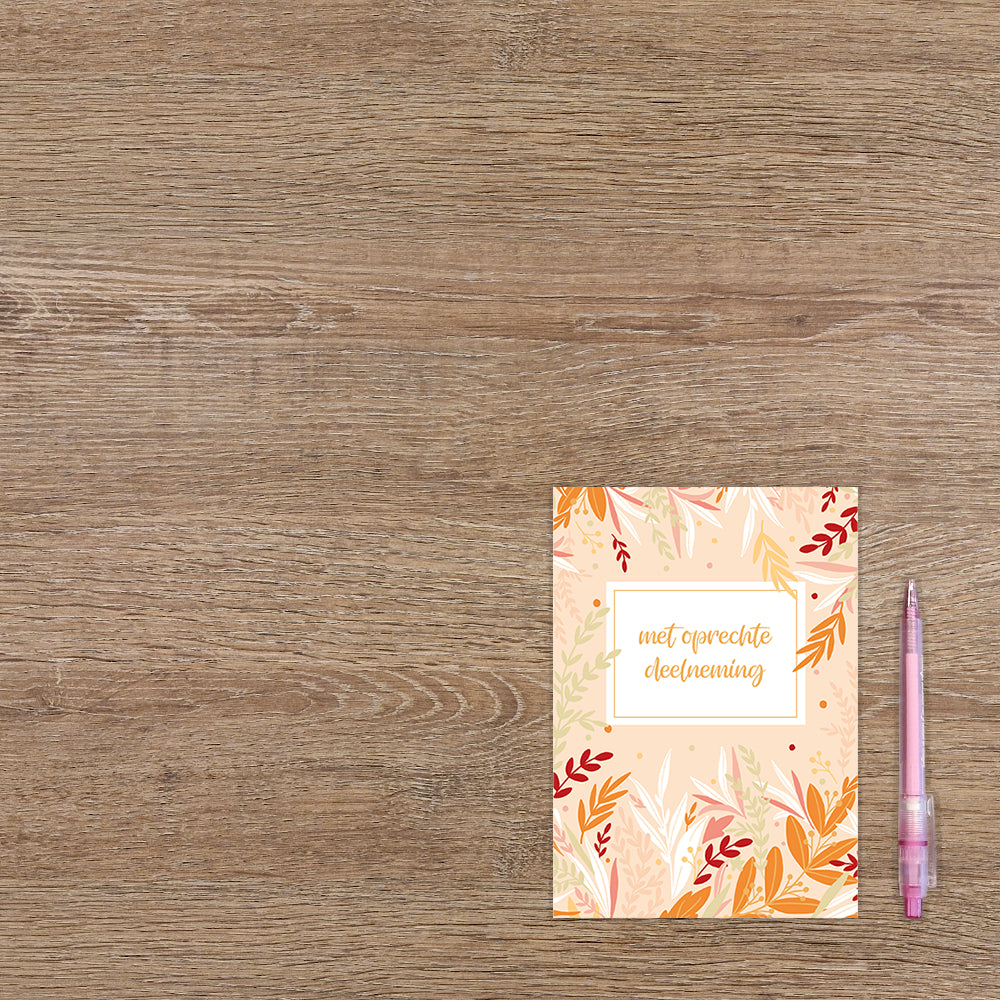 De wenskaart heeft een afmeting van x en een staande vorm. Op deze wenskaart staan bladeren in de kleuren rood, geel, wit, roze en oranje, op een beige achtergrond. In het midden staat een wit vak met de tekst: "Met oprechte deelneming". De binnenzijde van de wenskaart is bedrukt met de tekst "Veel sterkte met dit verlies".