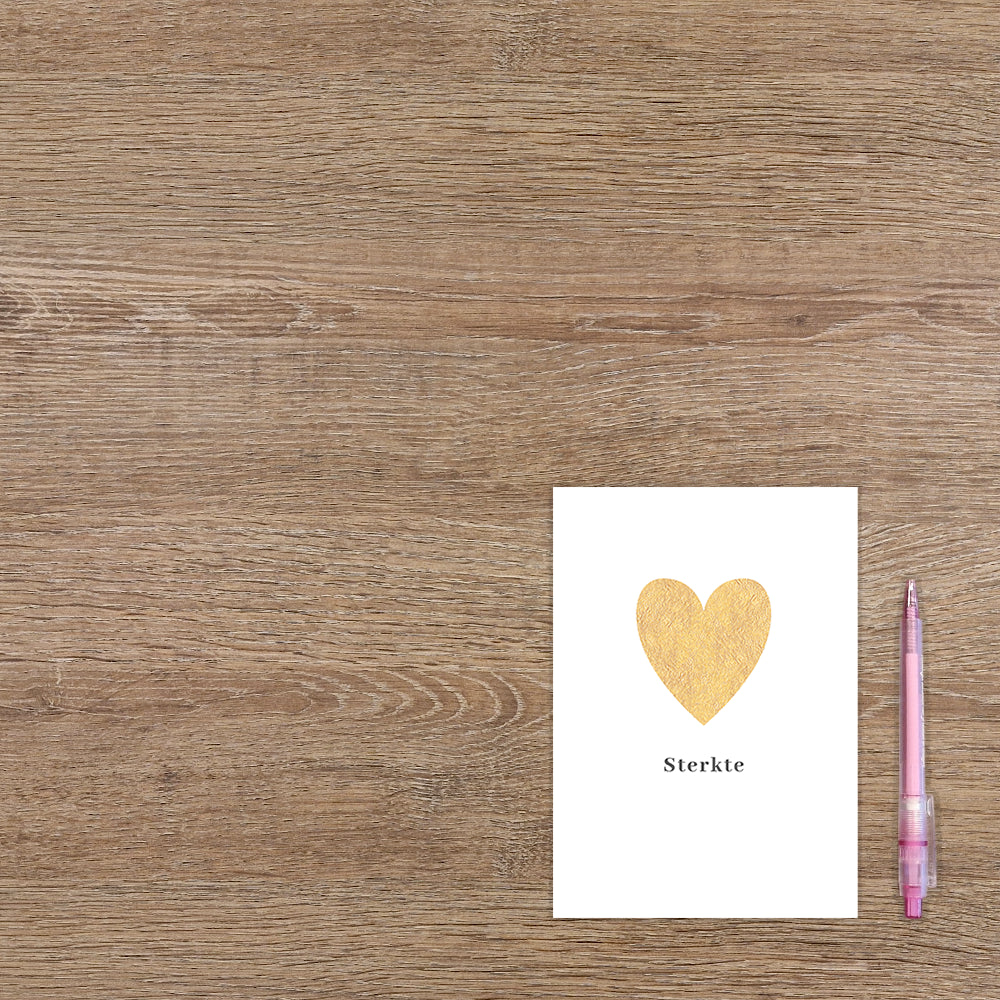 De wenskaart heeft een afmeting van x en een liggende vorm. Op deze wenskaart staat een gouden hart met daaronder de tekst: "Sterkte". De binnenzijde van de wenskaart is blanco wat voldoende ruimte geeft om een persoonlijke boodschap te schrijven .