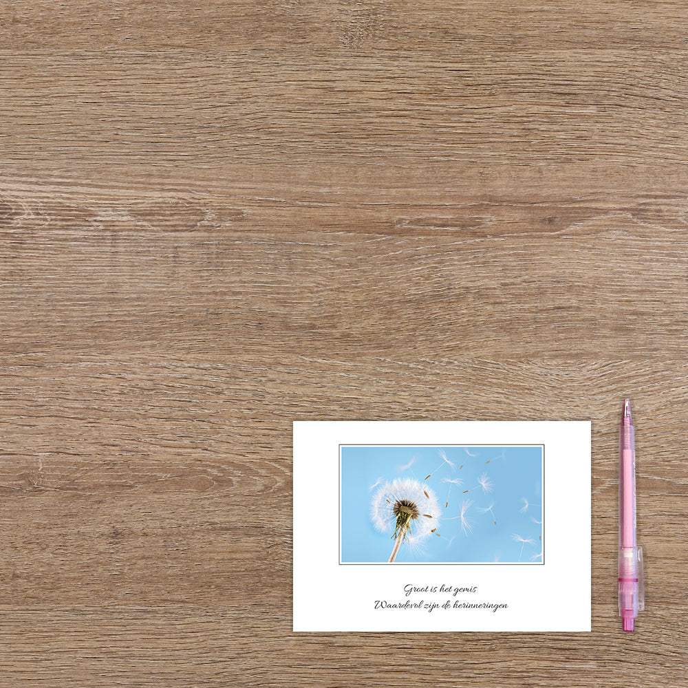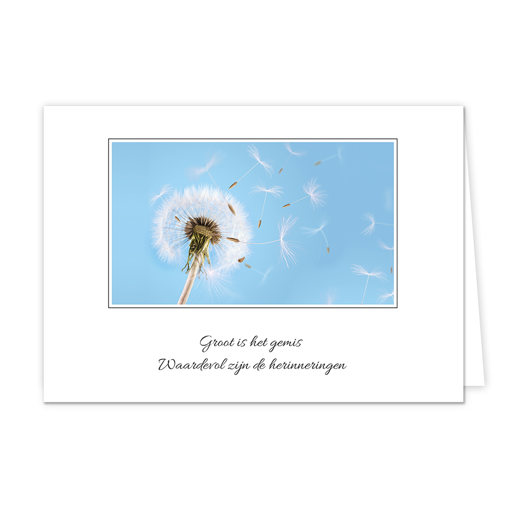 De wenskaart heeft een afmeting van x en een liggende vorm. Op deze wenskaart staat een paardenbloem op een blauwe achtergrond met daaronder de tekst: "Groot is het gemis, waardevol zijn de herinneringen". De binnenzijde van de wenskaart is bedrukt met de tekst "Veel sterkte in deze moeilijke tijd".