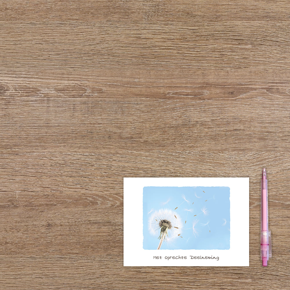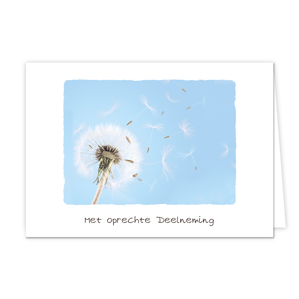 De wenskaart heeft een afmeting van x en een liggende vorm. Op de wenskaart is een paardenbloem te zien op een blauwe achtergrond, waarbij een aantal zaadjes weg vliegen. Onder de illustratie staat de tekst "Met oprechte deelneming". De binnenzijde van de wenskaart is bedrukt met de tekst Veel sterkte in deze moeilijke tijd. .
