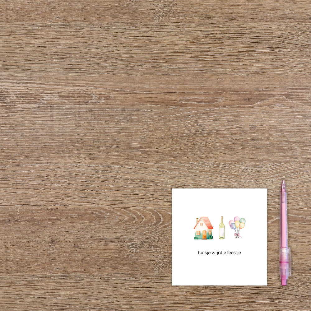 De wenskaart heeft een afmeting van x en een vierkante vorm. Op deze wenskaart staat een huis, fles wijn en ballonnen met daaronder de tekts: "Huisje wijntje feestje". De binnenzijde van de wenskaart is blanco wat voldoende ruimte geeft om een persoonlijke boodschap te schrijven .