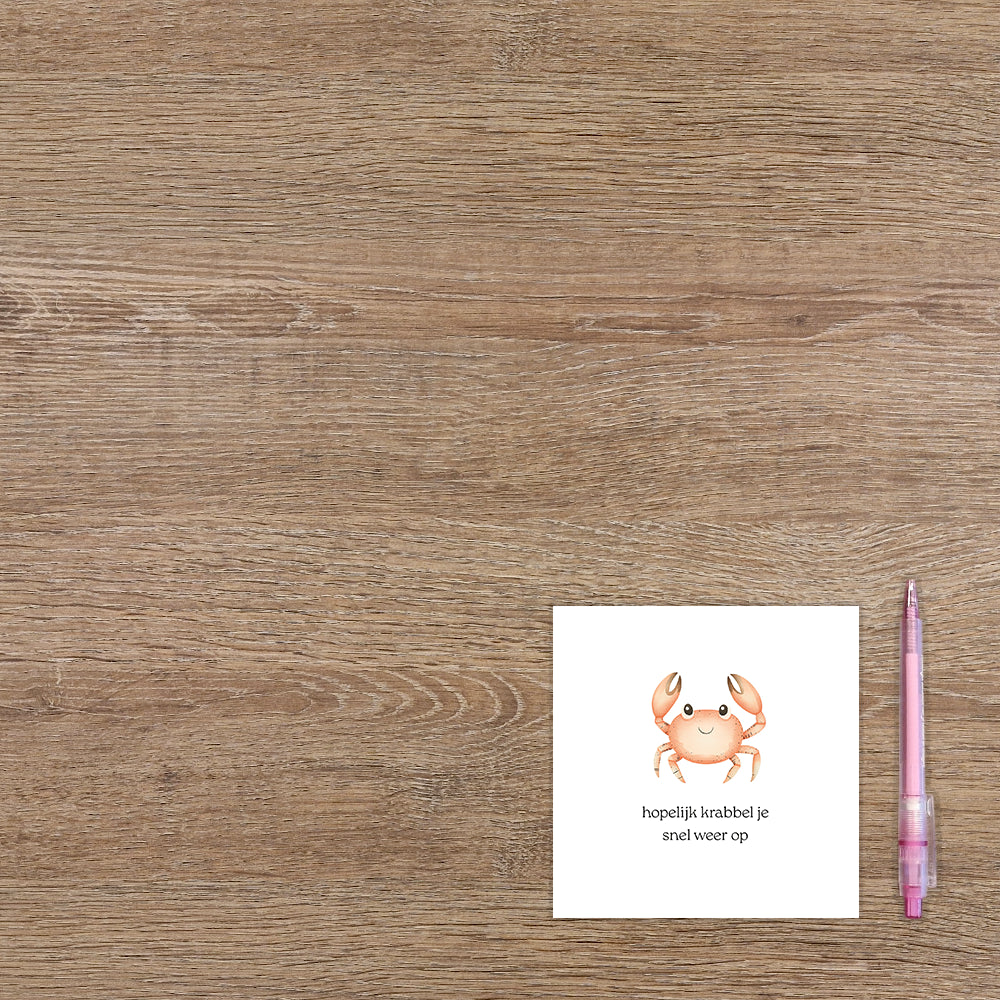 De wenskaart heeft een afmeting van x en een vierkante vorm. Op deze wenskaart staat een krab met daaronder de tekst: "Hopelijk krabbel je snel weer op". De binnenzijde van de wenskaart is blanco wat voldoende ruimte geeft om een persoonlijke boodschap te schrijven .