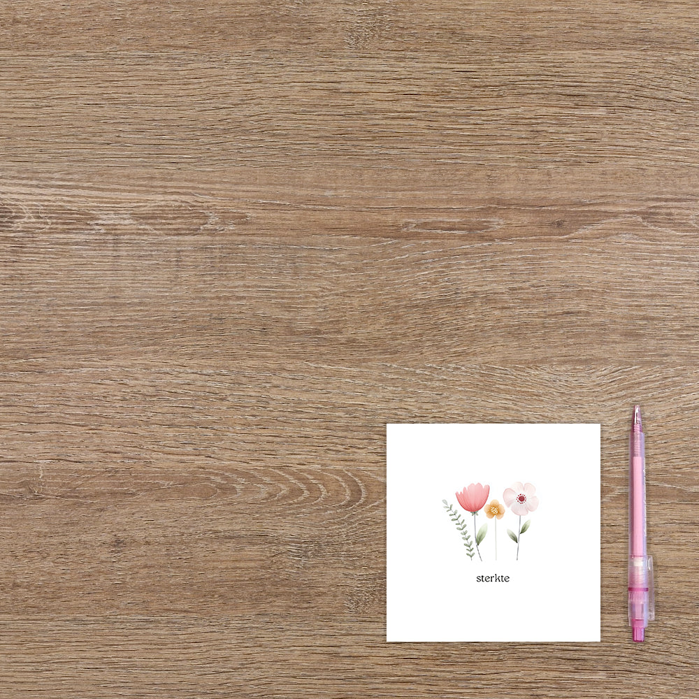 De wenskaart heeft een afmeting van x en een vierkante vorm. Op deze wenskaart staan bloemen met daaronder de tekst: "Sterkte". De binnenzijde van de wenskaart is blanco wat voldoende ruimte geeft om een persoonlijke boodschap te schrijven .
