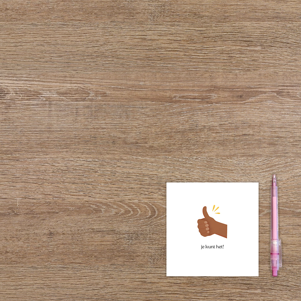 De wenskaart heeft een afmeting van x en een vierkante vorm. Op deze wenskaart staat een duim op een witte achtergrond met daaronder de tekst: "Je kunt het!". De binnenzijde van de wenskaart is blanco wat voldoende ruimte geeft om een persoonlijke boodschap te schrijven .