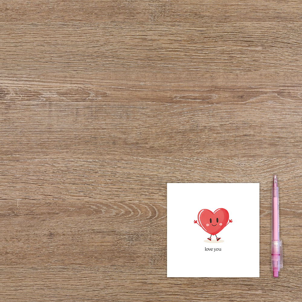 De wenskaart heeft een afmeting van x en een vierkante vorm. Op deze wenskaart staat een rood hart met daaronder de tekst: "Love you". De binnenzijde van de wenskaart is blanco wat voldoende ruimte geeft om een persoonlijke boodschap te schrijven .