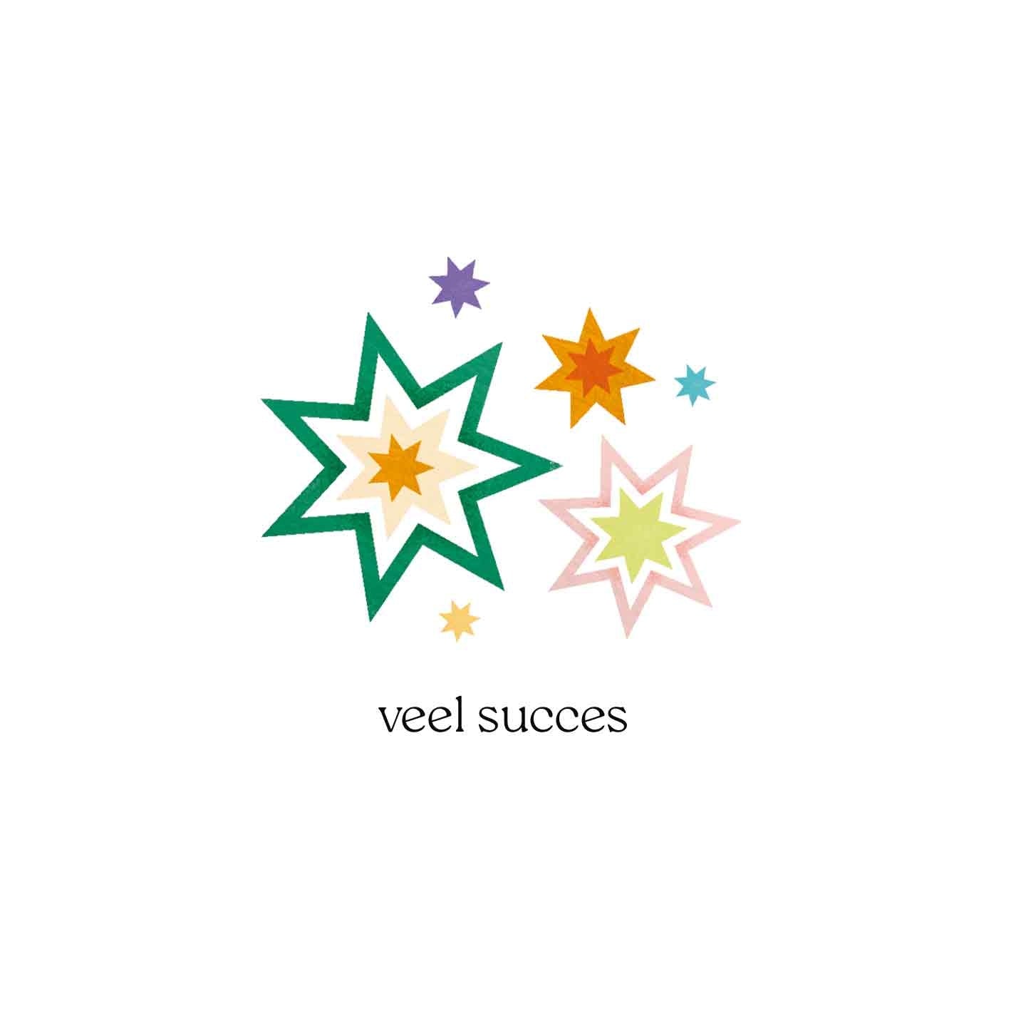 De wenskaart heeft een afmeting van x en een vierkante vorm. Op deze wenskaart staan sterren in de kleuren groen, geel, oranje, roze, blauw en paars, op een witte achtergrond. Daaronder staat de tekst: "Veel succes". De binnenzijde van de wenskaart is blanco wat voldoende ruimte geeft om een persoonlijke boodschap te schrijven .