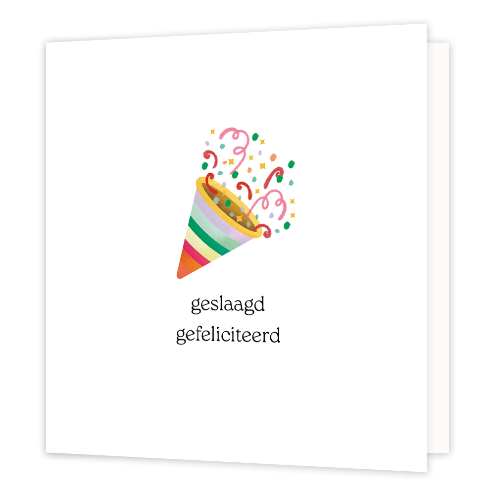 De wenskaart heeft een afmeting van x en een vierkante vorm. Op deze wenskaart staat een feesthoedje waar slingers en confetti uit komt. Daaronder staat de tekst: "Geslaagd gefeliciteerd". De binnenzijde van de wenskaart is blanco wat voldoende ruimte geeft om een persoonlijke boodschap te schrijven .