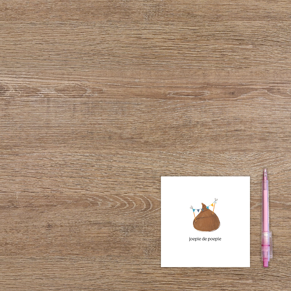 De wenskaart heeft een afmeting van x en een vierkante vorm. Op deze wenskaart staat een drolletje met slingers op een witte achtergrond. Daaronder staat de tekst: "Joepie de poepie". De binnenzijde van de wenskaart is blanco wat voldoende ruimte geeft om een persoonlijke boodschap te schrijven .