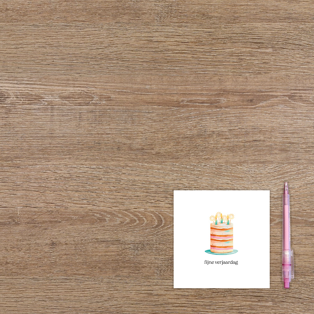 De wenskaart heeft een afmeting van x en een vierkante vorm. Op deze wenskaart staat een taart in de kleuren oranje, roze en beige met daaronder de tekst: "Fijne verjaardag". De binnenzijde van de wenskaart is blanco wat voldoende ruimte geeft om een persoonlijke boodschap te schrijven .