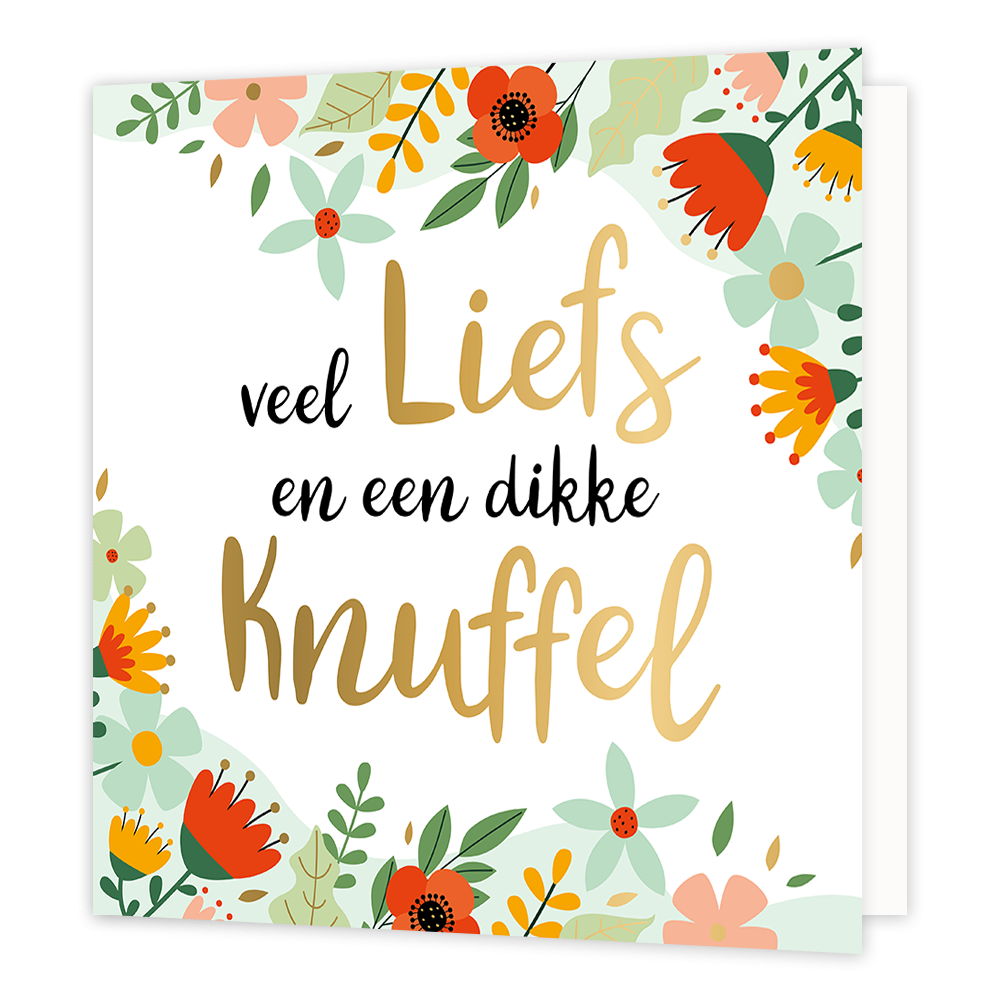 De wenskaart heeft een afmeting van x en een vierkante vorm. Op deze wenskaart staan bloemen in de kleuren groen, oranje, rood en roze met in het midden de tekst: "Veel liefs en een dikke knuffel". De binnenzijde van de wenskaart is blanco wat voldoende ruimte geeft om een persoonlijke boodschap te schrijven .
