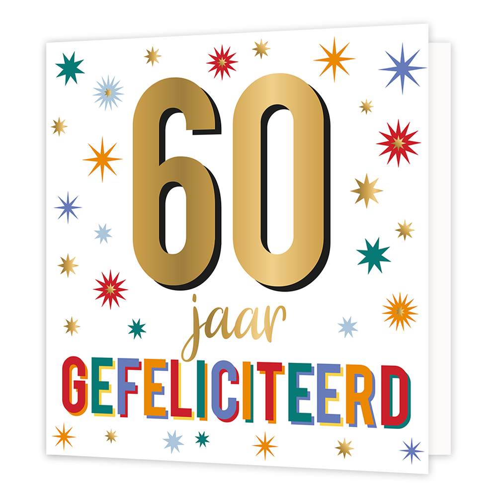 De wenskaart heeft een afmeting van x en een vierkante vorm. Op deze wenskaart staan sterren in de kleuren groen, blauw, rood, oranje, paars en goud. In het midden staat de tekst: "60 jaar gefeliciteerd". De binnenzijde van de wenskaart is blanco wat voldoende ruimte geeft om een persoonlijke boodschap te schrijven .