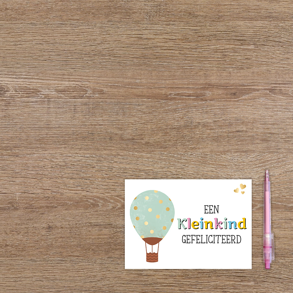 De wenskaart heeft een afmeting van x en een liggende vorm. Op deze wenskaart staat een grote luchtballon in de kleur mintgroen met gouden stippen. Rechts daarvan staat de teskt: "Een kleinkind gefeliciteerd". De binnenzijde van de wenskaart is blanco wat voldoende ruimte geeft om een persoonlijke boodschap te schrijven .