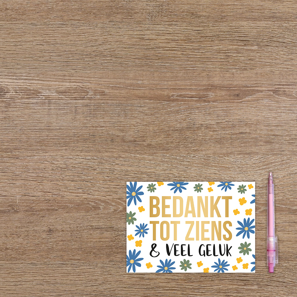 De wenskaart heeft een afmeting van x en een liggende vorm. Op deze wenskaart staan bloemen in de kleuren groen en blauw met gouden details. In het midden staat de tekst: "Bedankt tot ziens & veel geluk". De binnenzijde van de wenskaart is blanco wat voldoende ruimte geeft om een persoonlijke boodschap te schrijven .