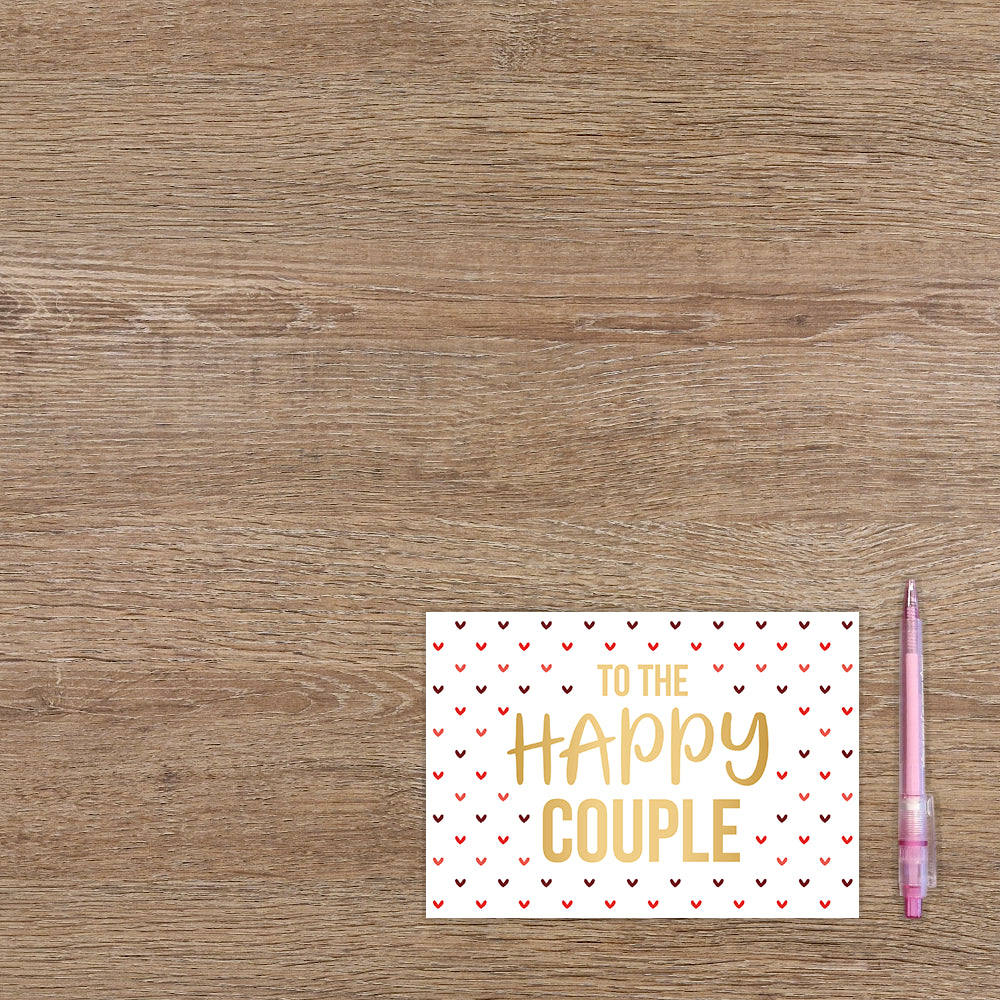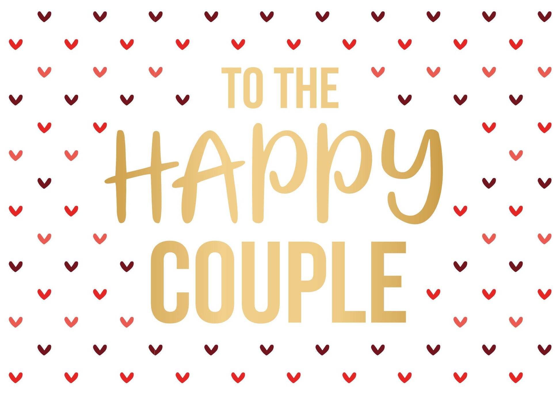 De wenskaart heeft een afmeting van x en een liggende vorm. Op deze wenskaart staan hartjes in de kleuren rood en bordeauxrood met in het midden de tekst: "To the happy couple". De binnenzijde van de wenskaart is blanco wat voldoende ruimte geeft om een persoonlijke boodschap te schrijven .