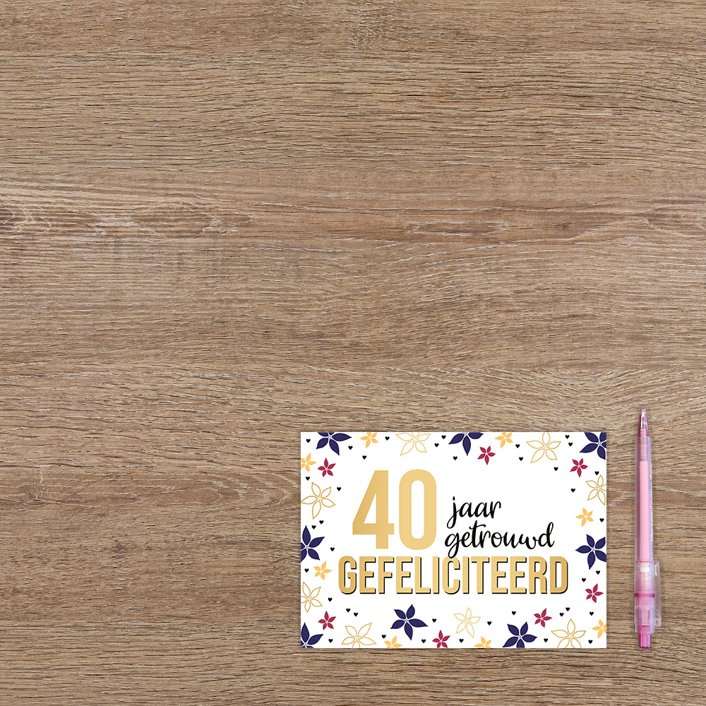 De wenskaart heeft een afmeting van x en een liggende vorm. Op deze wenskaart staan blauwe, roden en gouden bloemen met zwarte hartjes. In het midden staat de tekst: "40 jaar getrouwd gefeliciteerd". De binnenzijde van de wenskaart is blanco wat voldoende ruimte geeft om een persoonlijke boodschap te schrijven .