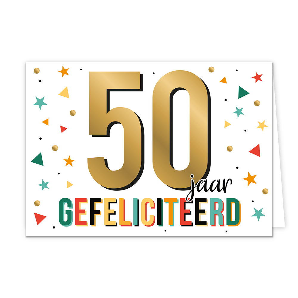 De wenskaart heeft een afmeting van x en een liggende vorm. Op deze wenskaart staan sterren, driehoeken en stippen in de kleuren groen, geel, rood, oranje, blauw en goud. In het midden staat de tekst: "50 jaar gefeliciteerd". De binnenzijde van de wenskaart is blanco wat voldoende ruimte geeft om een persoonlijke boodschap te schrijven .