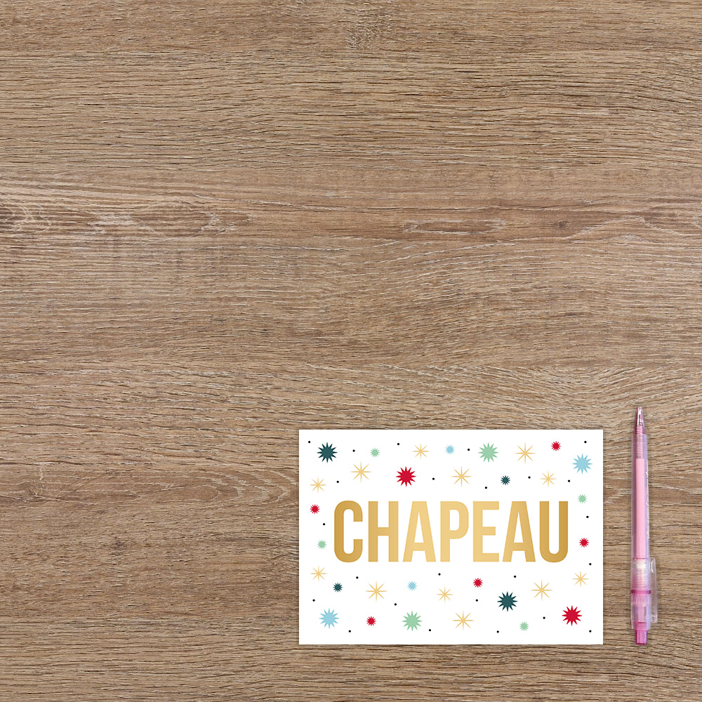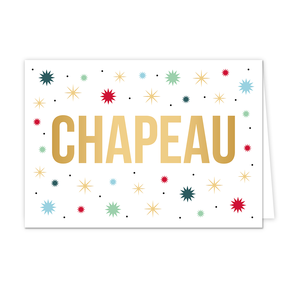 De wenskaart heeft een afmeting van x en een liggende vorm. Op deze wenskaart staan sterren in de kleuren groen, rood, blauw en goud met zwarte stippen. In het midden staat de tekst: "Chapeau". De binnenzijde van de wenskaart is blanco wat voldoende ruimte geeft om een persoonlijke boodschap te schrijven .