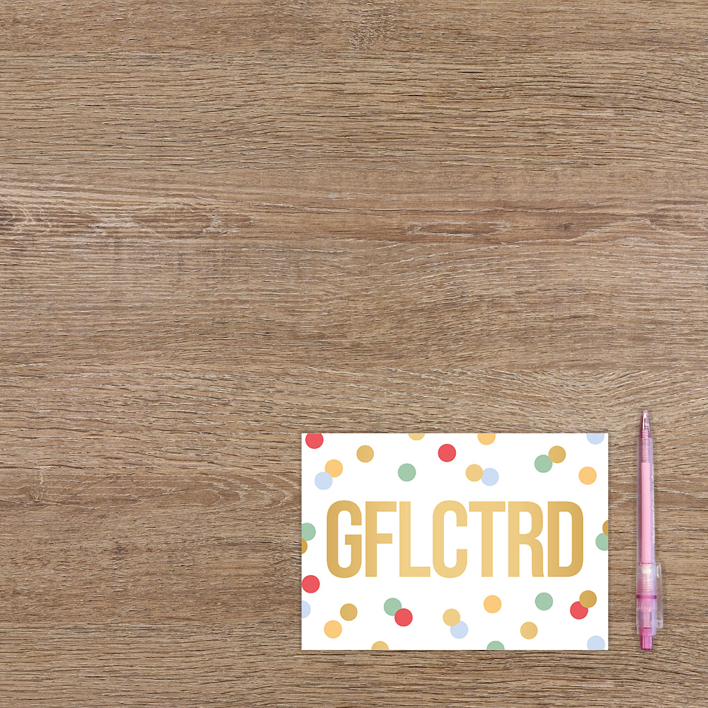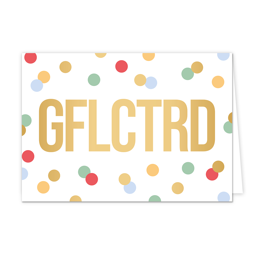 De wenskaart heeft een afmeting van x en een liggende vorm. Op deze wenskaart staan stippen in de kleuren geel, groen, paars, rood en goud. In het midden staat de tekst: "GFLCTRD". De binnenzijde van de wenskaart is blanco wat voldoende ruimte geeft om een persoonlijke boodschap te schrijven .