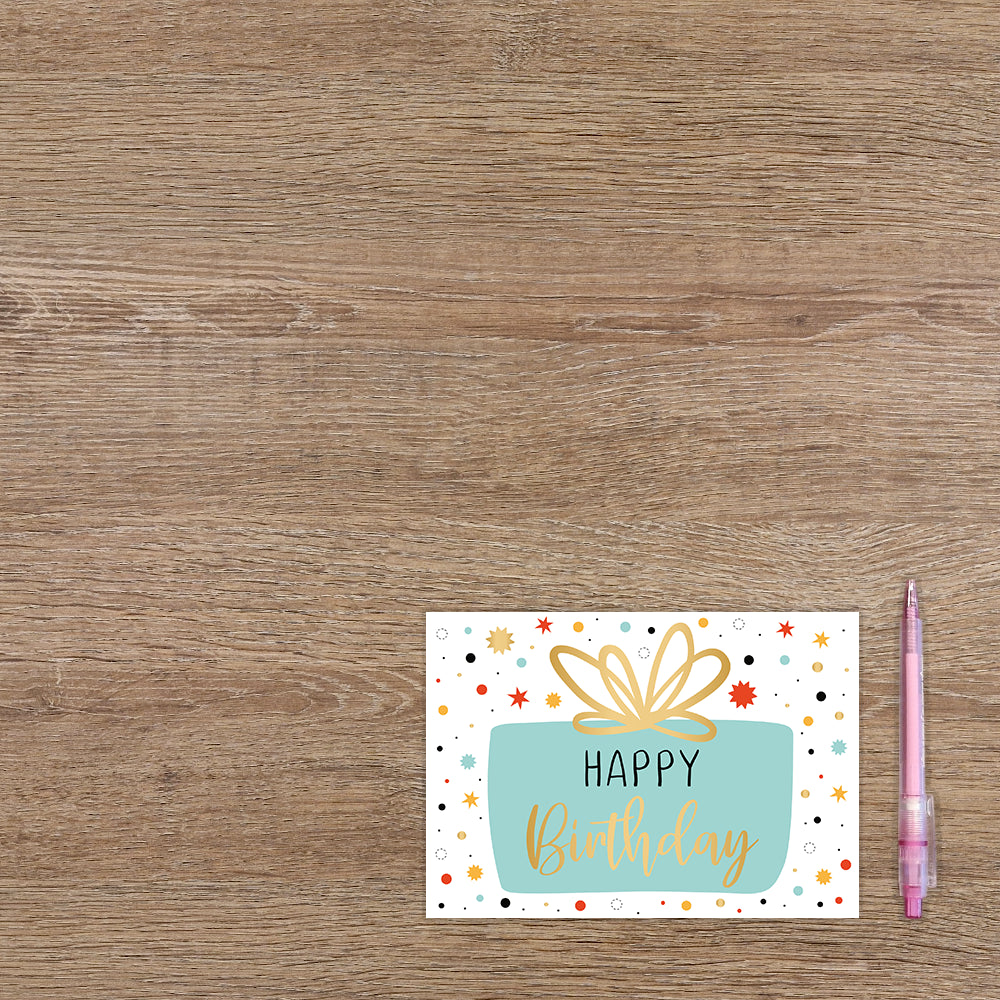De wenskaart heeft een afmeting van x en een liggende vorm. Op deze wenskaart staat een groot mintgroen cadeau met stippen en sterren in de kleuren rood, mintgroen, oranje, zwart en goud. In het midden staat de tekst: "Happy birthday". De binnenzijde van de wenskaart is blanco wat voldoende ruimte geeft om een persoonlijke boodschap te schrijven .