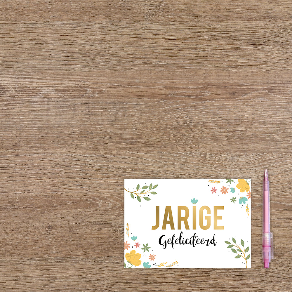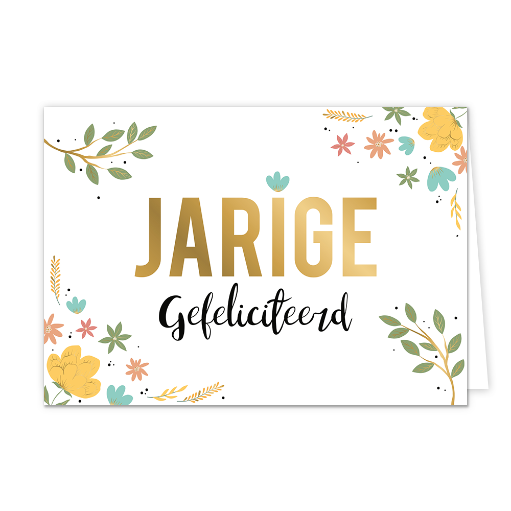 De wenskaart heeft een afmeting van x en een liggende vorm. Op deze wenskaart staan bloemen in de kleuren geel, blauw, oranje en groen. In het midden staat de tekst: "Jarige gefeliciteerd". De binnenzijde van de wenskaart is blanco wat voldoende ruimte geeft om een persoonlijke boodschap te schrijven .