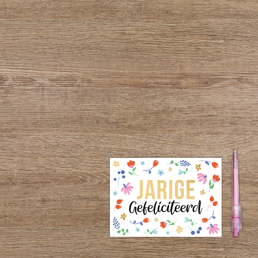 De wenskaart heeft een afmeting van x en een liggende vorm. Op deze wenskaart zijn diverse bloemen allerlei soorten bloemen zichtbaar in de kleuren rood, roze, blauw en geel. In het midden staat de tekst "Jarige gefliciteerd" waarbij de tekst "Jarige" groots en in goud geschreven staat. De binnenzijde van de wenskaart is blanco wat voldoende ruimte geeft om een persoonlijke boodschap te schrijven .