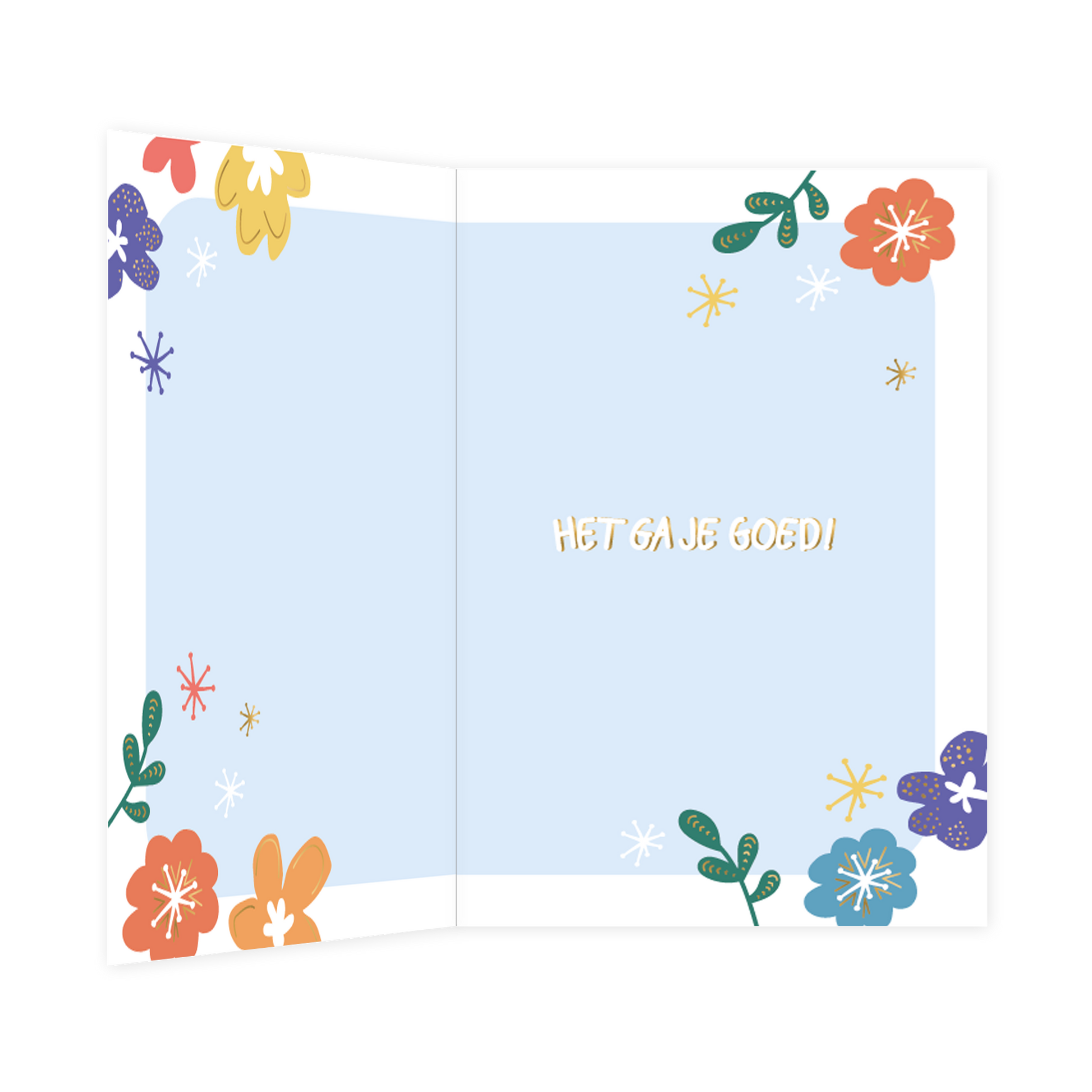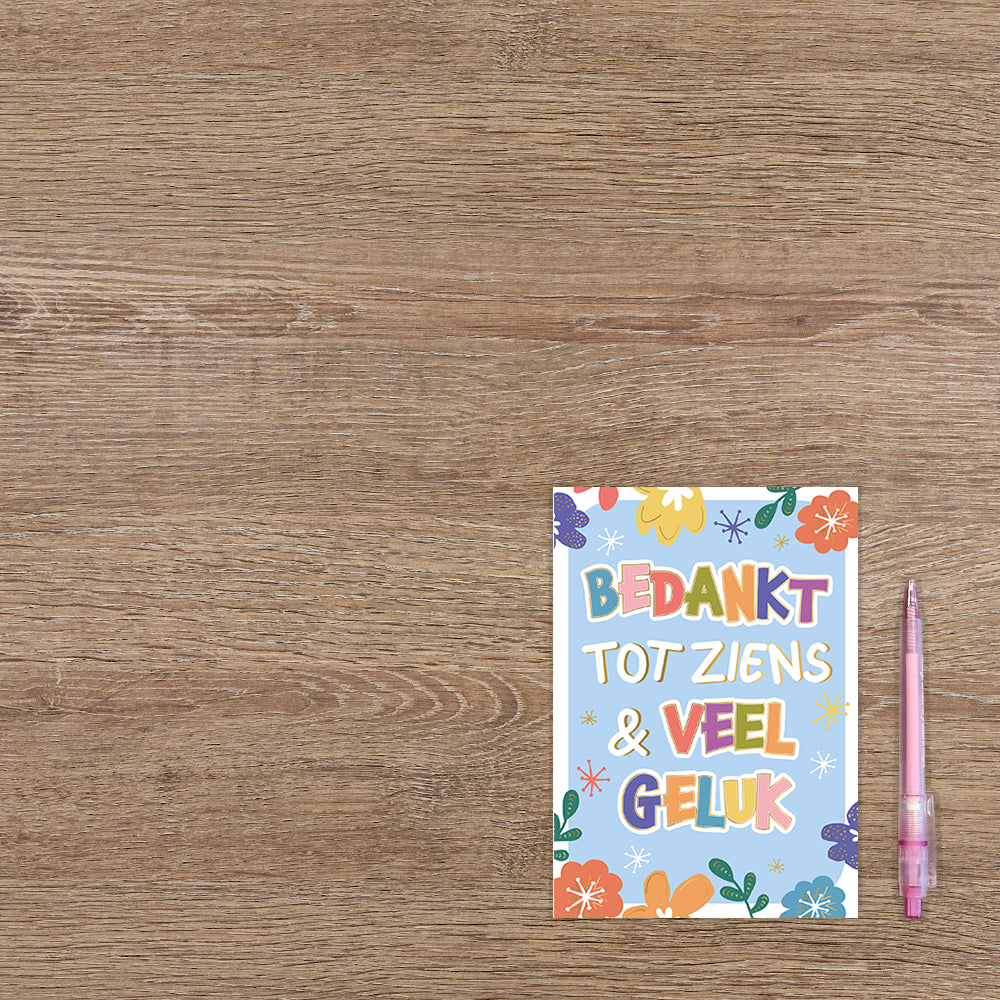 De wenskaart heeft een afmeting van x en een staande vorm. Op deze wenskaart staan bloemen in de kleuren groen, rood, geel, paars en blauw. In het midden staat de tekst: "Bedankt tot ziens & veel geluk". De binnenzijde van de wenskaart is bedrukt met een ontwerp passend bij de voorzijde van de kaart en de tekst "Het ga je goed!"..