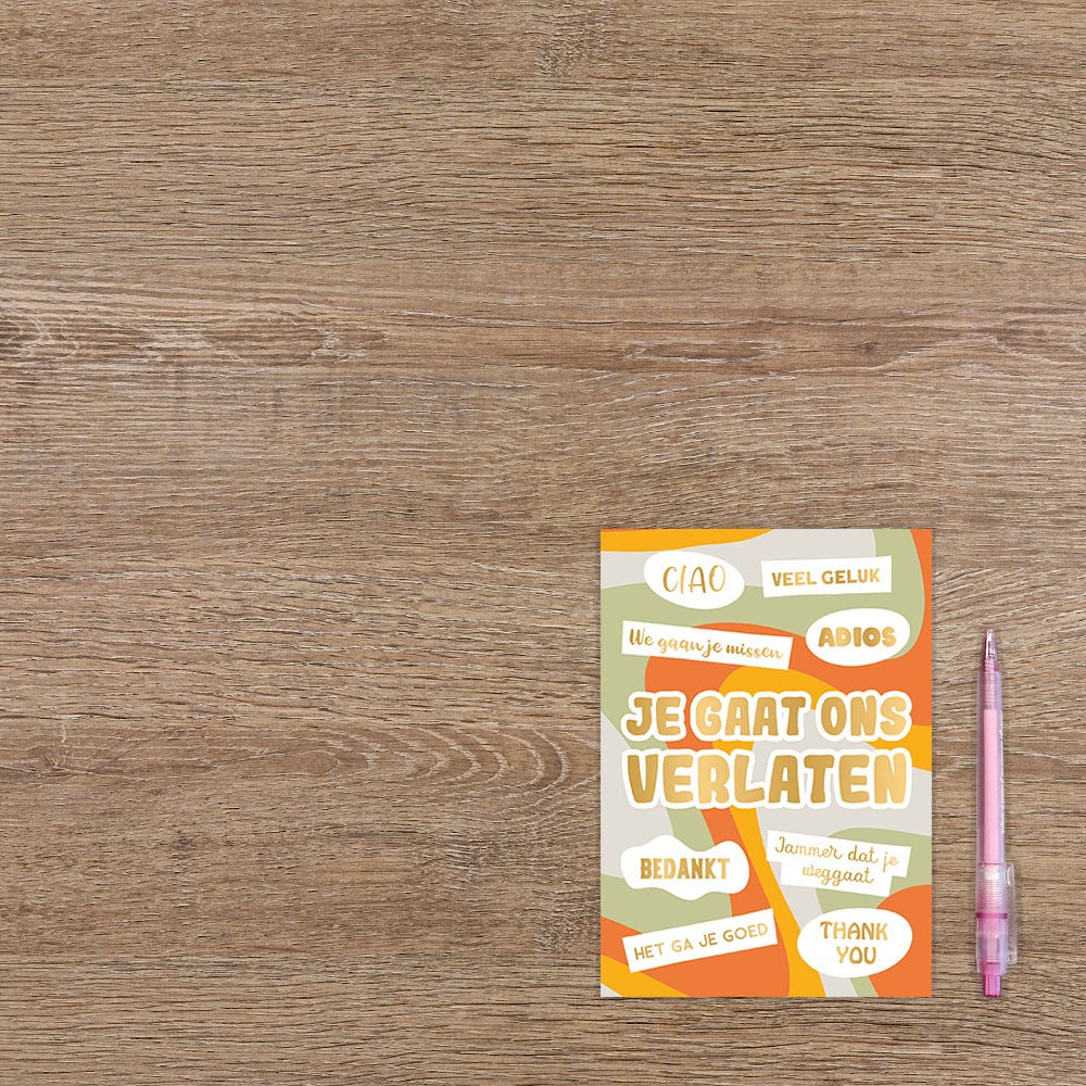 De wenskaart heeft een afmeting van x en een staande vorm. Op deze wenskaart staan lijnen in de kleuren oranje, groen, wit en geel waarbij in witte vakken diverse teksten zoals "Adios" en "Ciao" staan. In het midden staat de tekst "Je gaat ons verlaten". De binnenzijde van de wenskaart is bedrukt met een ontwerp passend bij de voorzijde van de kaart .
