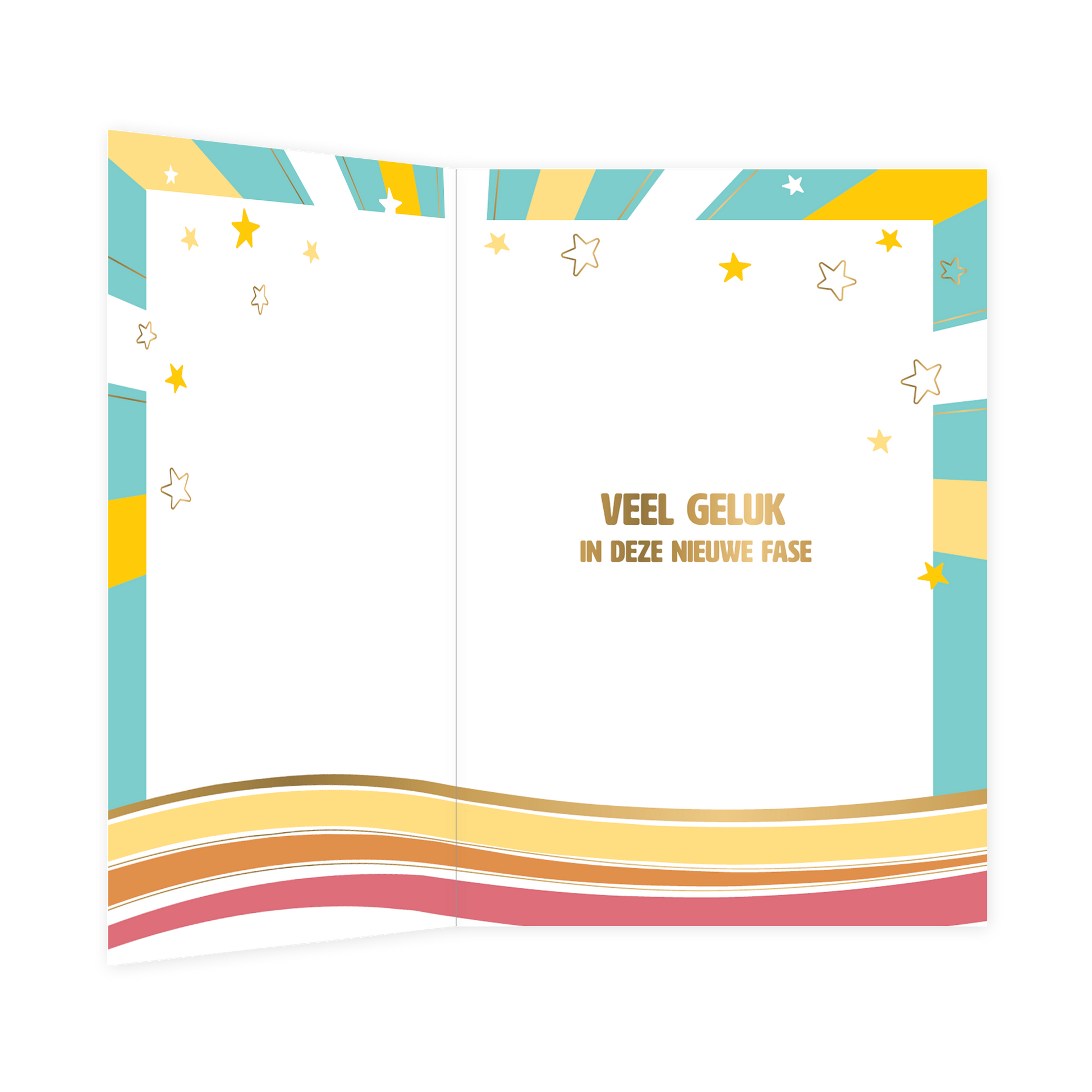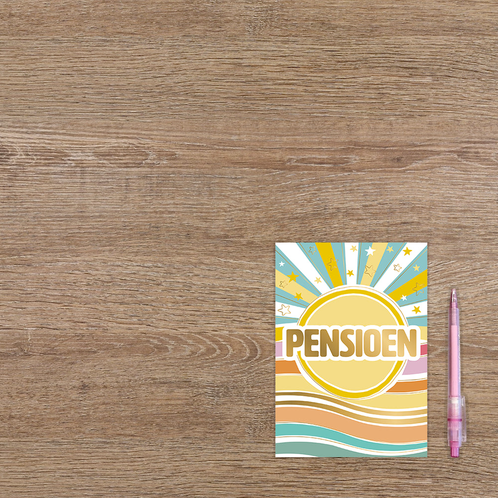 De wenskaart heeft een afmeting van x en een staande vorm. Op deze wenskaart staat een zon met zonnestralen in diverse kleuren en in het midden de tekst: "Pensioen". De binnenzijde van de wenskaart is blanco wat voldoende ruimte geeft om een persoonlijke boodschap te schrijven .