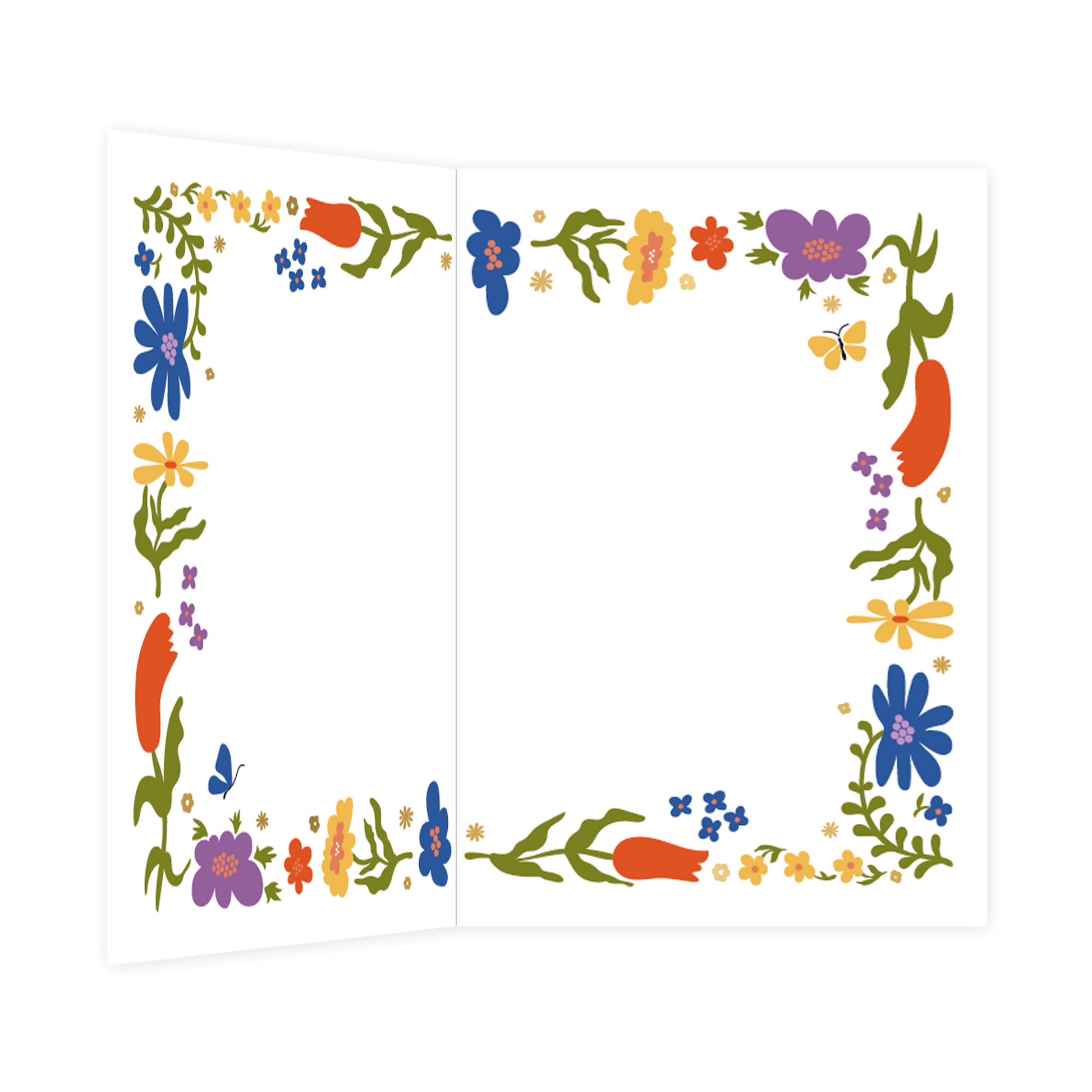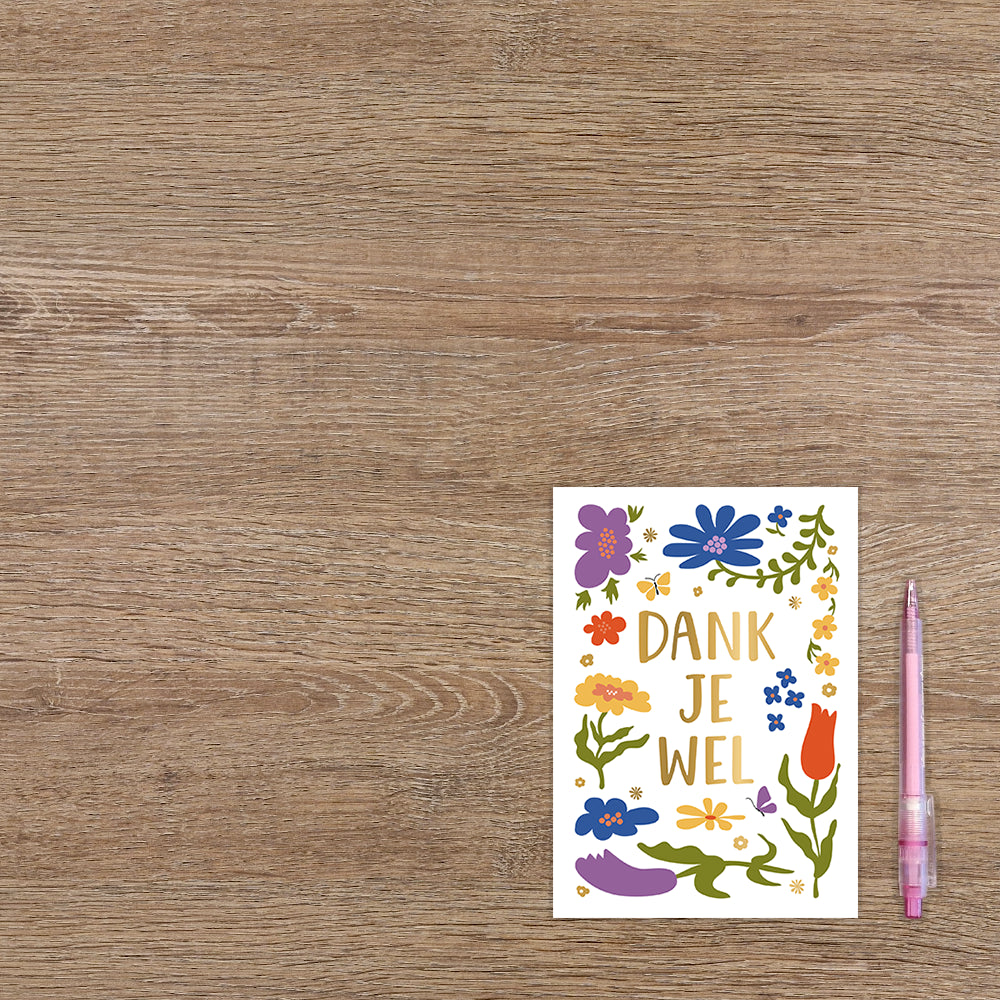 De wenskaart heeft een afmeting van x en een staande vorm. Op deze wenskaart staan bloemen in de kleuren paars, blauw, geel, rood en groen met in het midden de tekst: "Dank je wel". De binnenzijde van de wenskaart is bedrukt met een ontwerp passend bij de voorzijde van de kaart .