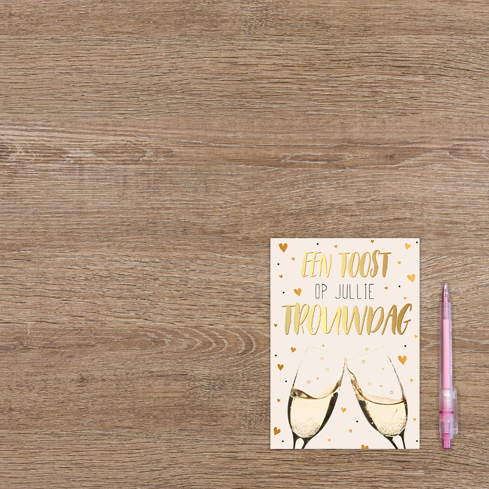 De wenskaart heeft een afmeting van x en een staande vorm. Op deze wenskaart staan twee champagneflessen met hartjes eromheen en bovenaan de tekst: "Een toost op jullie trouwdag". De binnenzijde van de wenskaart is bedrukt met een ontwerp passend bij de voorzijde van de kaart en de tekst "Hartelijk gefeliciteerd".