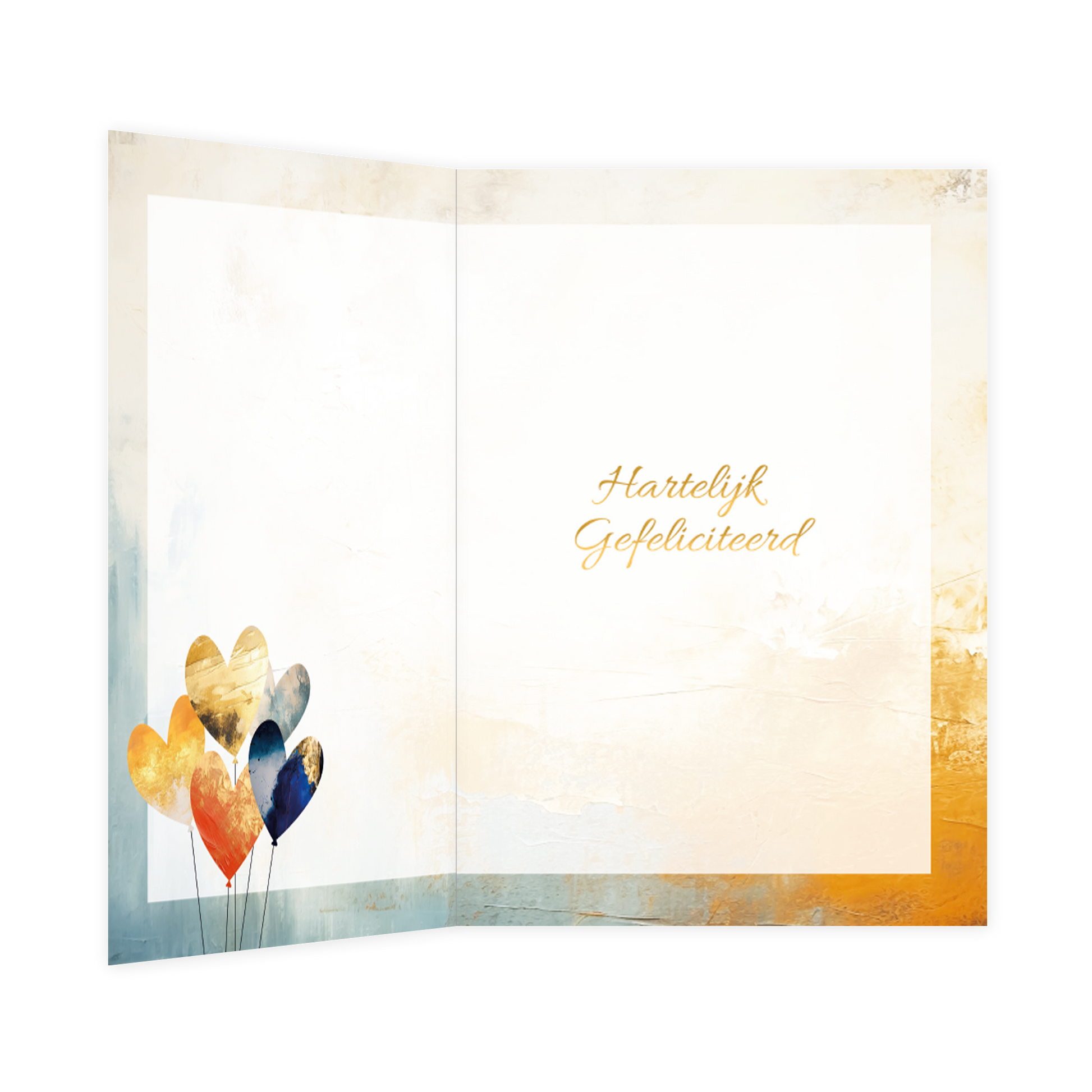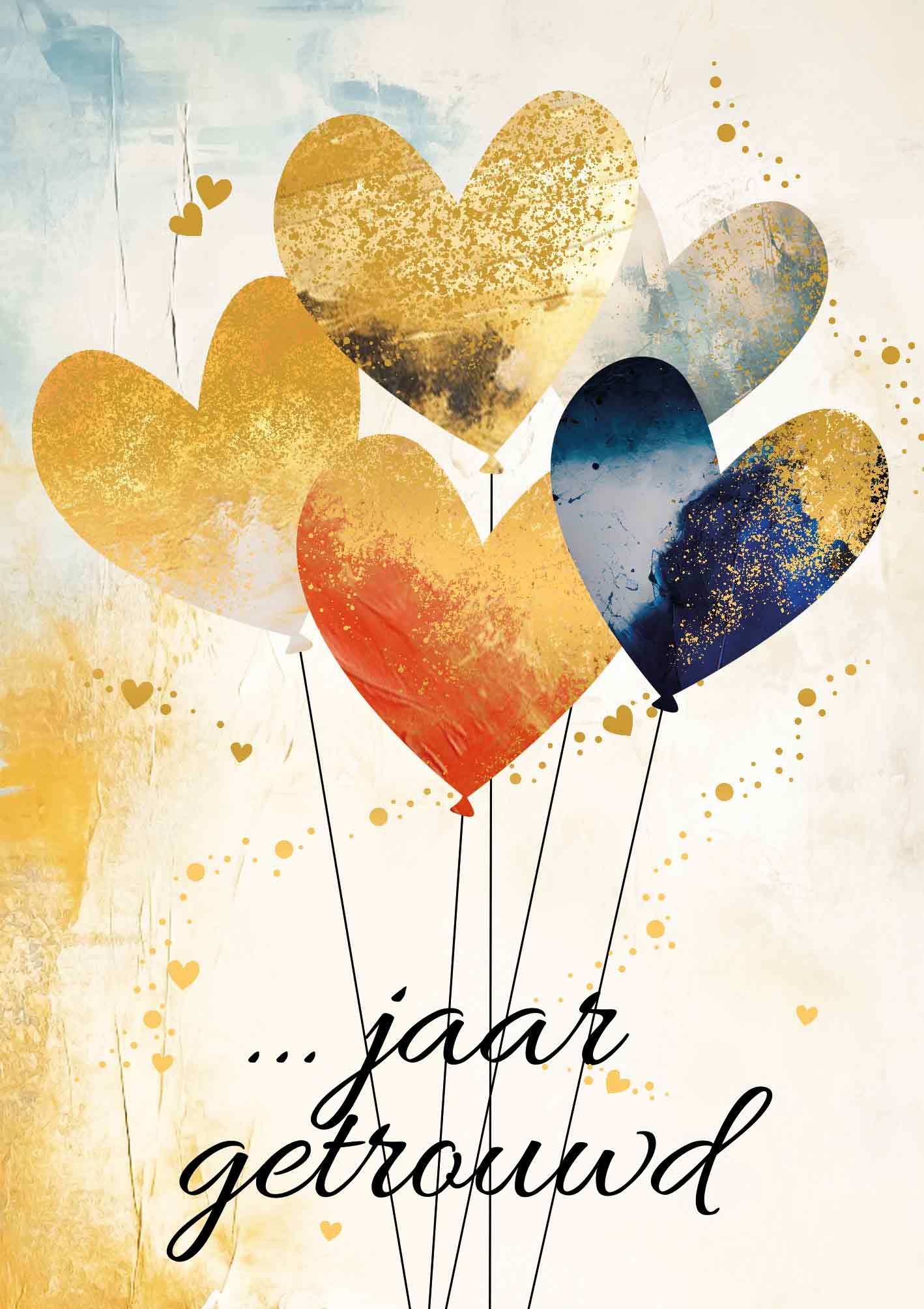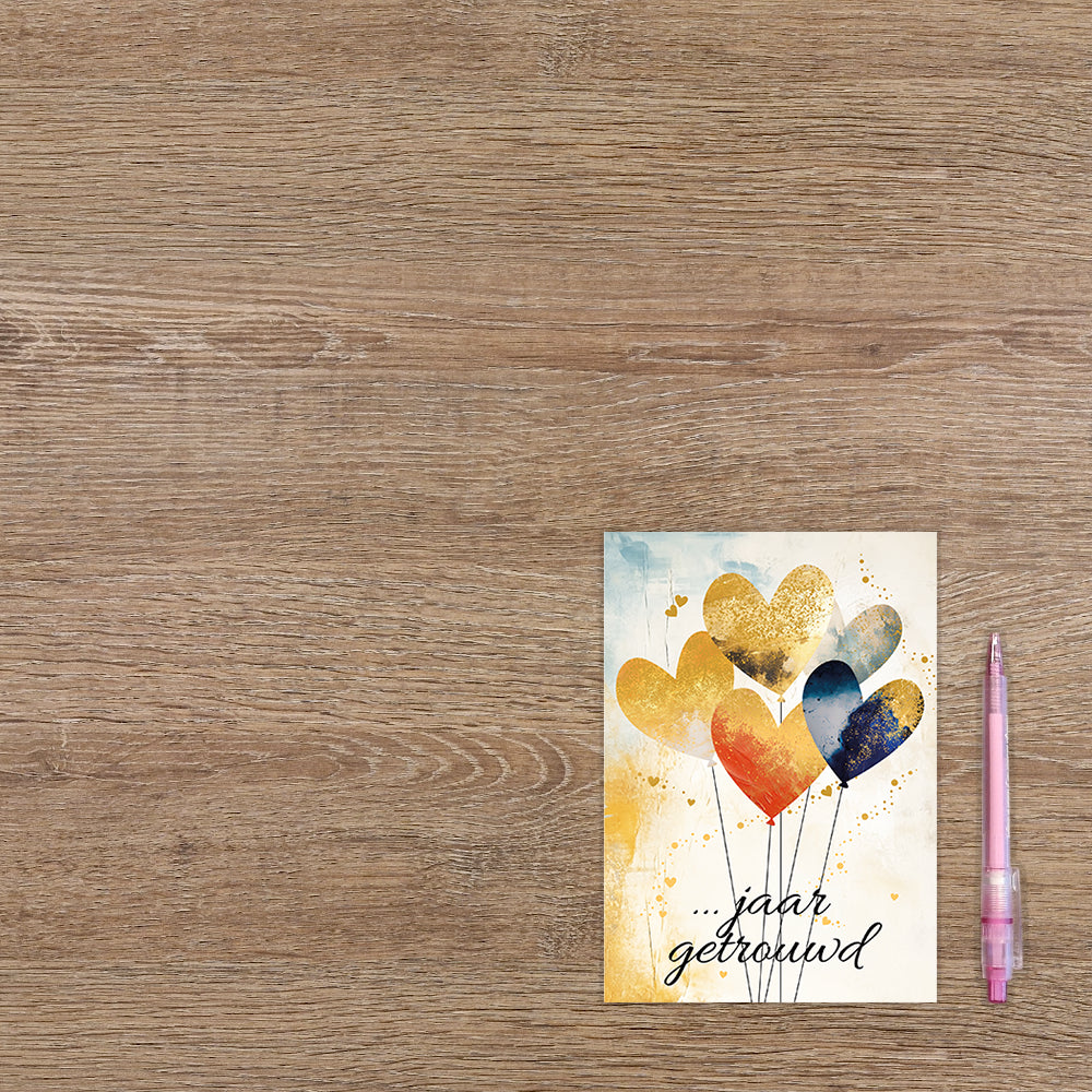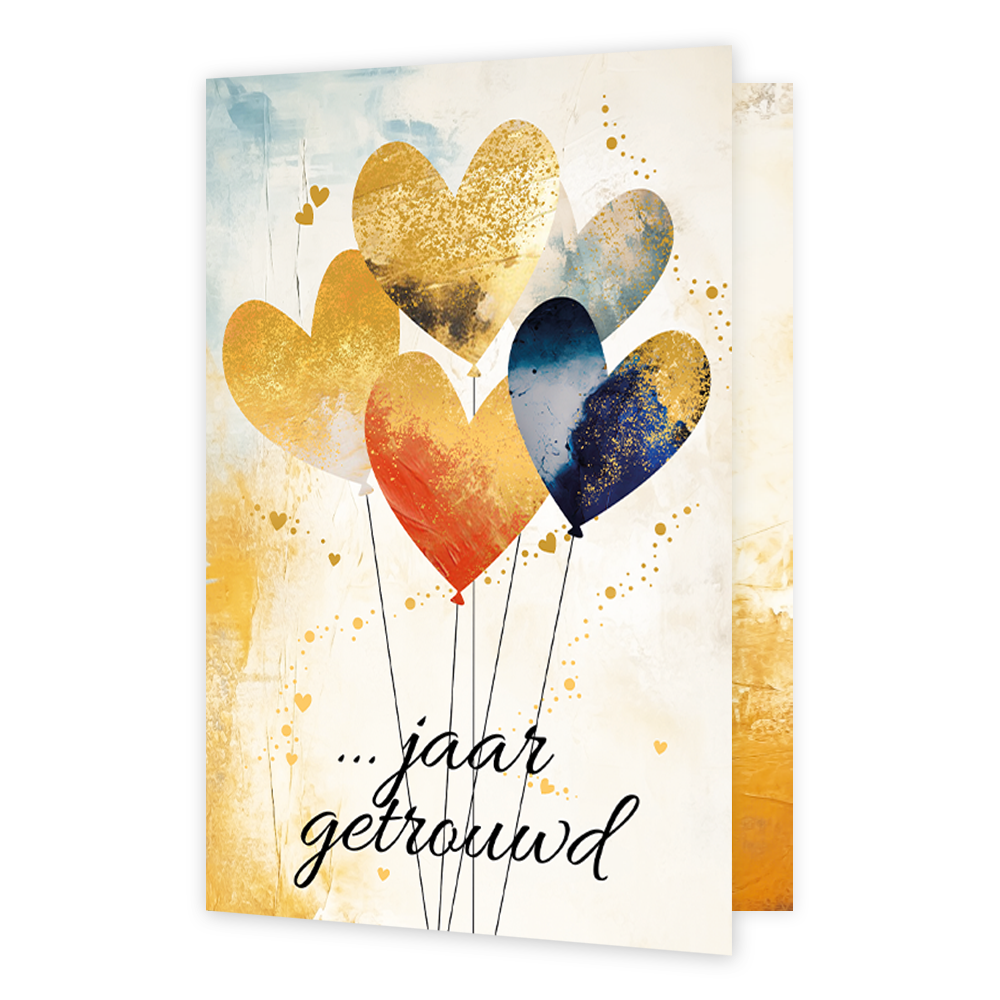 De wenskaart heeft een afmeting van x en een staande vorm. Op deze wenskaart staan hartjesballonnen met daaronder de tekst: "... jaar getrouwd". De binnenzijde van de wenskaart is bedrukt met een ontwerp passend bij de voorzijde van de kaart en de tekst "Hartelijk gefeliciteerd".