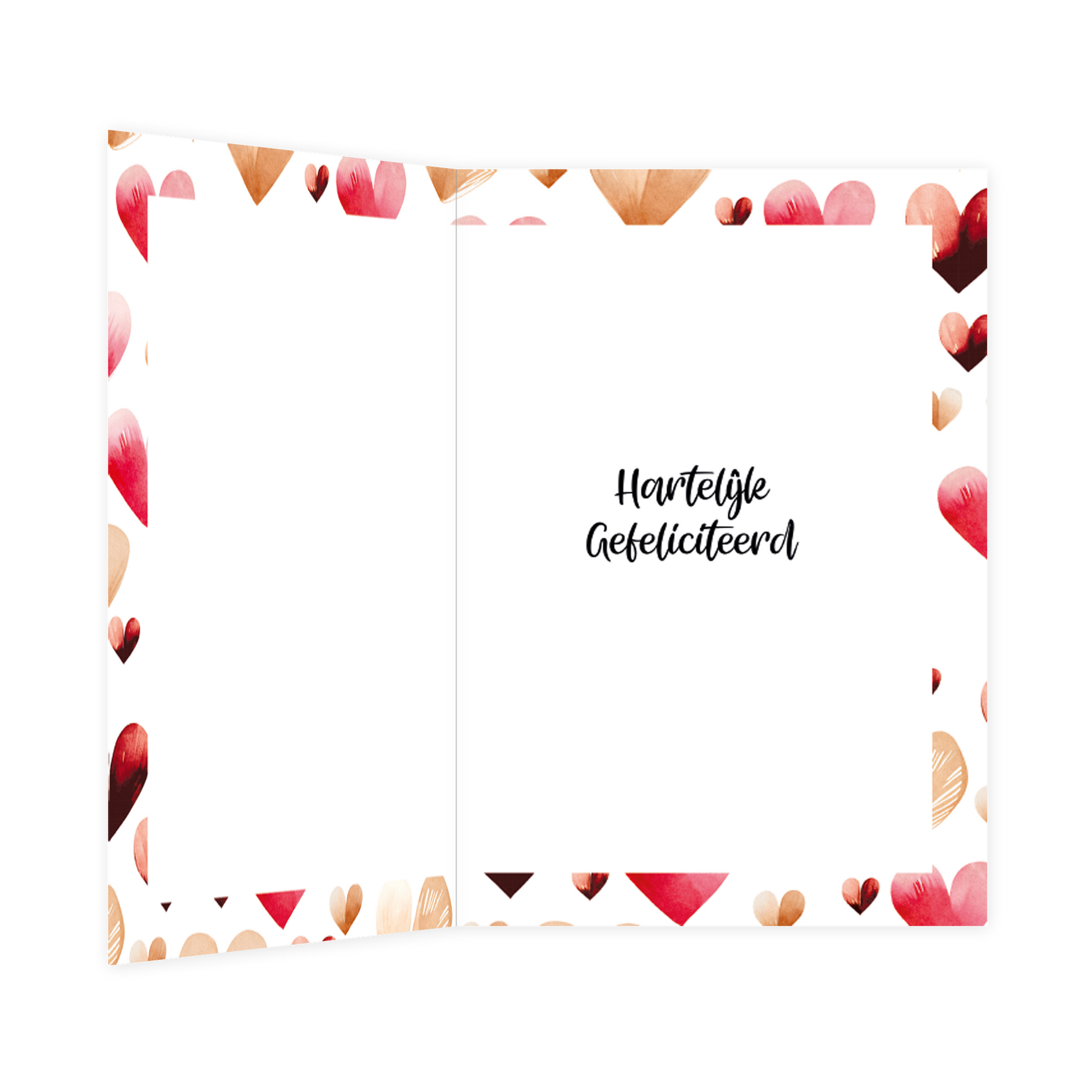 De wenskaart heeft een afmeting van x en een staande vorm. Op deze wenskaart staan hartjes in de kleuren rood, roze en beige met in het midden de tekst: "12,5 jaar getrouwd". De binnenzijde van de wenskaart is bedrukt met een ontwerp passend bij de voorzijde van de kaart en de tekst "Hartelijk gefeliciteerd".