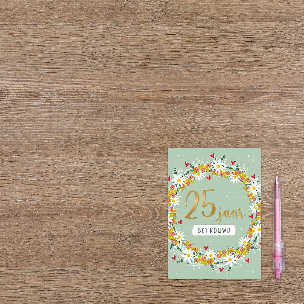 De wenskaart heeft een afmeting van x en een staande vorm. Op deze wenskaart staat een bloemencirkel in de kleuren wit, groen, geel en rood. In het midden staat de tekst: "25 jaar getrouwd". De binnenzijde van de wenskaart is bedrukt met een ontwerp passend bij de voorzijde van de kaart en de tekst "Hartelijk gefeliciteerd met jullie zilveren huwelijk".
