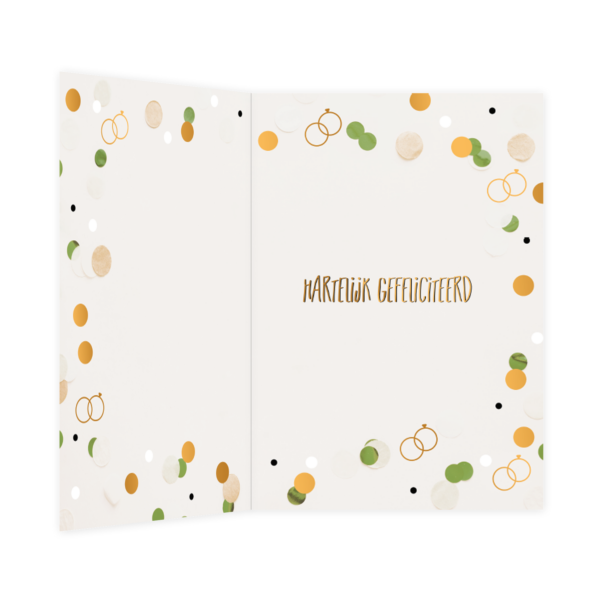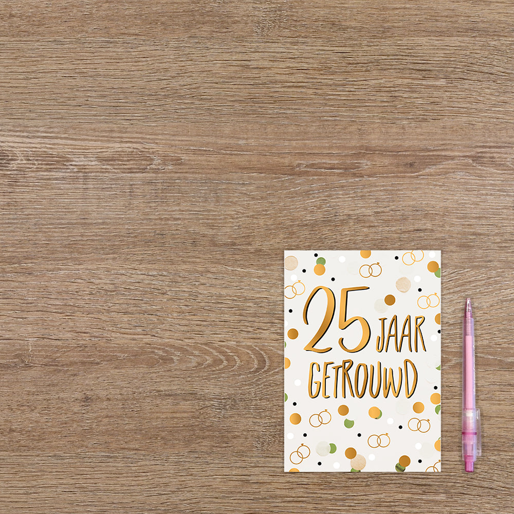 De wenskaart heeft een afmeting van x en een staande vorm. Op deze wenskaart staan stippen in de kleuren goud, wit en groen met gouden ringen. In het midden staat de tekst: "25 jaar getrouwd". De binnenzijde van de wenskaart is bedrukt met een ontwerp passend bij de voorzijde van de kaart en de tekst "Hartelijk gefeliciteerd".