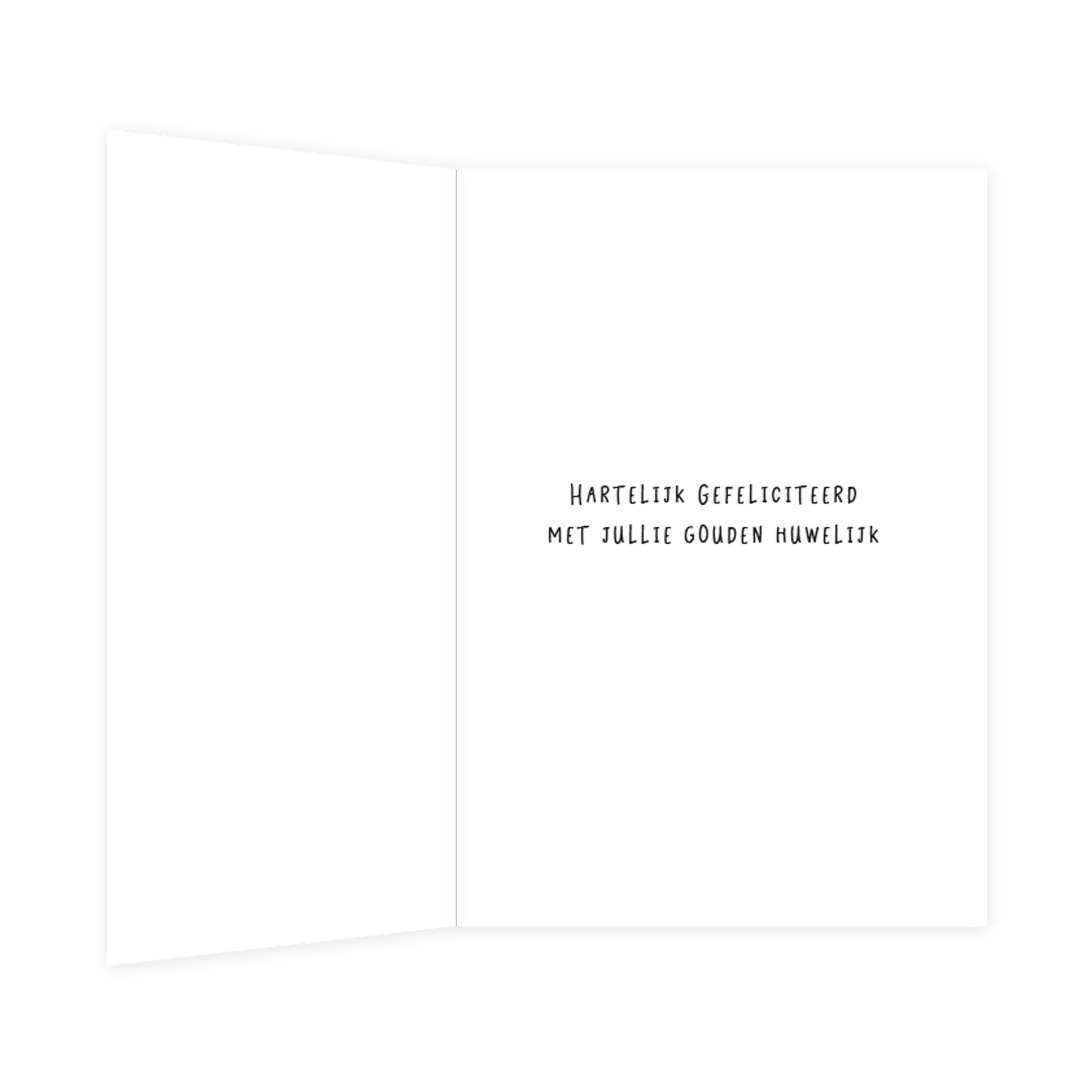 De wenskaart heeft een afmeting van x en een staande vorm. Op deze wenskaart staat een groot rood hart omringt door bloemen met in het midden de tekst: "50 jaar getrouwd". De binnenzijde van de wenskaart is bedrukt met een ontwerp passend bij de voorzijde van de kaart en de tekst "Hartelijk gefeliciteerd".