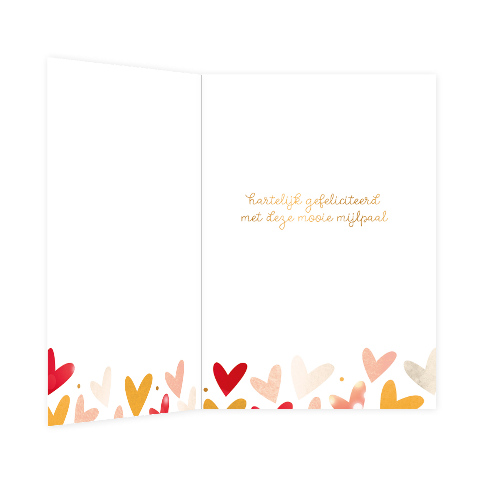 De wenskaart heeft een afmeting van x en een staande vorm. Op deze wenskaart staan hatjes in de kleuren beige, rood, roze en goud met in het midden de tekst: "50 jaar getrouwd". De binnenzijde van de wenskaart is bedrukt met een ontwerp passend bij de voorzijde van de kaart en de tekst "Hartelijk gefeliciteerd met deze mooie mijlpaal".