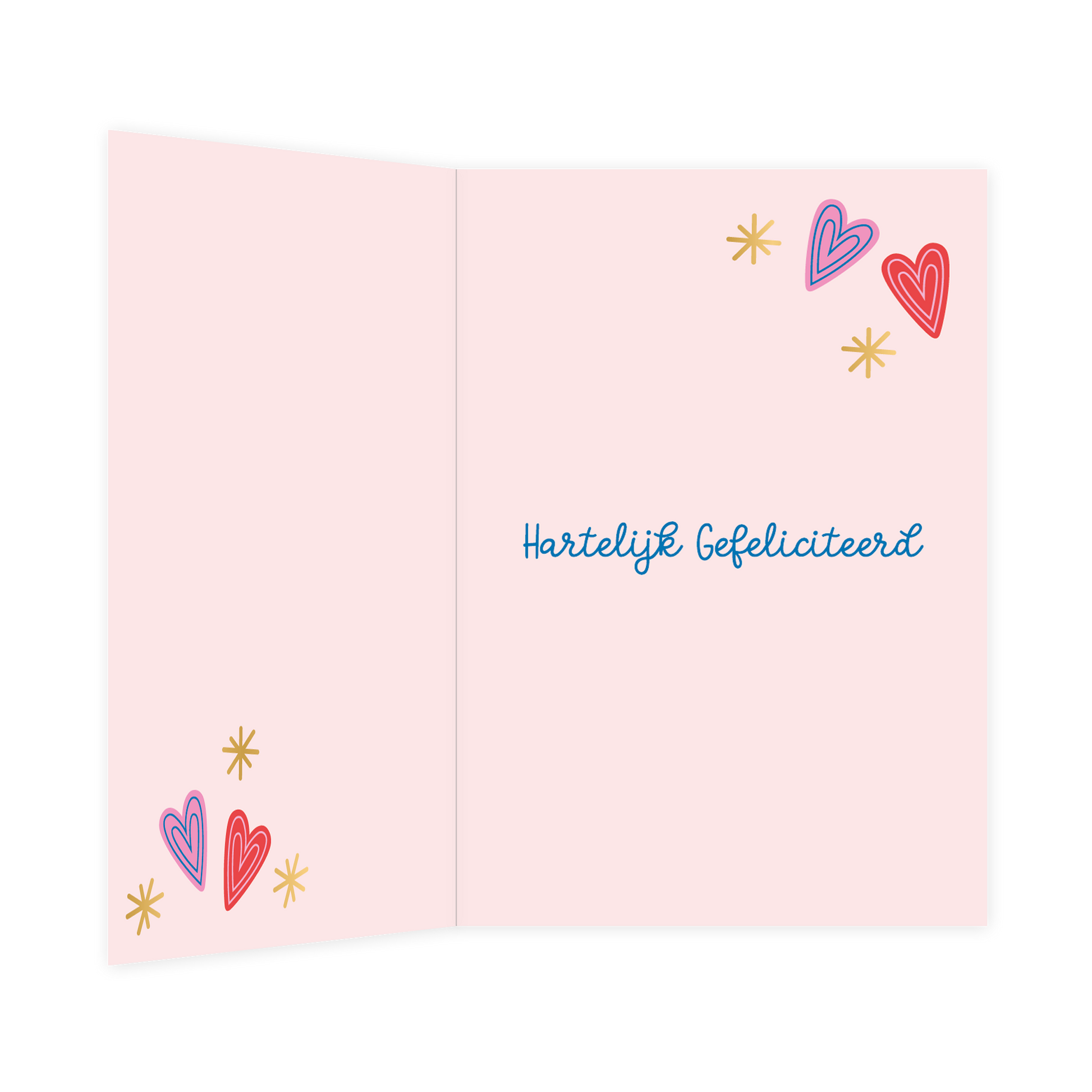 De wenskaart heeft een afmeting van 12cm x 17cm en een staande vorm. Op deze wenskaart staan de rode cijfers 50 en blauw tekst 'jaar getrouwd' in het midden van de kaart. Om de tekst heen staan rood en roze hartjes met blauw en witte details. De binnenzijde van de wenskaart is bedrukt met een ontwerp passend bij de voorzijde van de kaart en de tekst"Hartelijk gefeliciteerd".