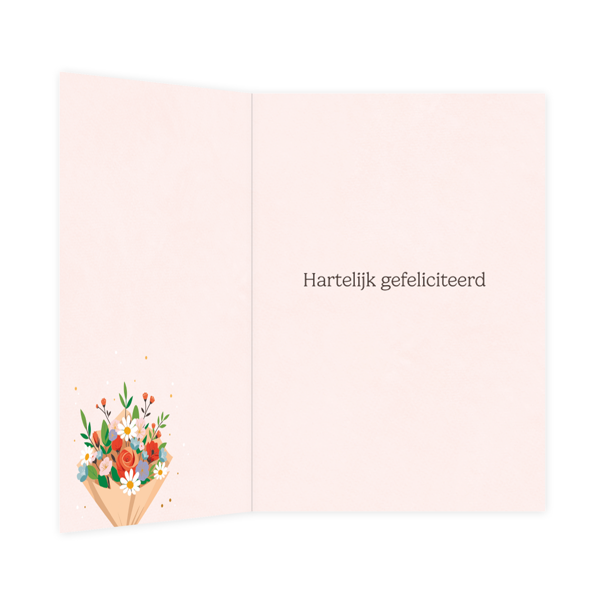 De wenskaart heeft een afmeting van x en een staande vorm. Op deze wenskaart staat een grote bos bloemen met de kleuren rood, wit, geel, groen, roze en blauw. Bovenaan staat de tekst: "60 jaar getrouwd". De binnenzijde van de wenskaart is bedrukt met een ontwerp passend bij de voorzijde van de kaart en de tekst "Hartelijk gefeliciteerd".