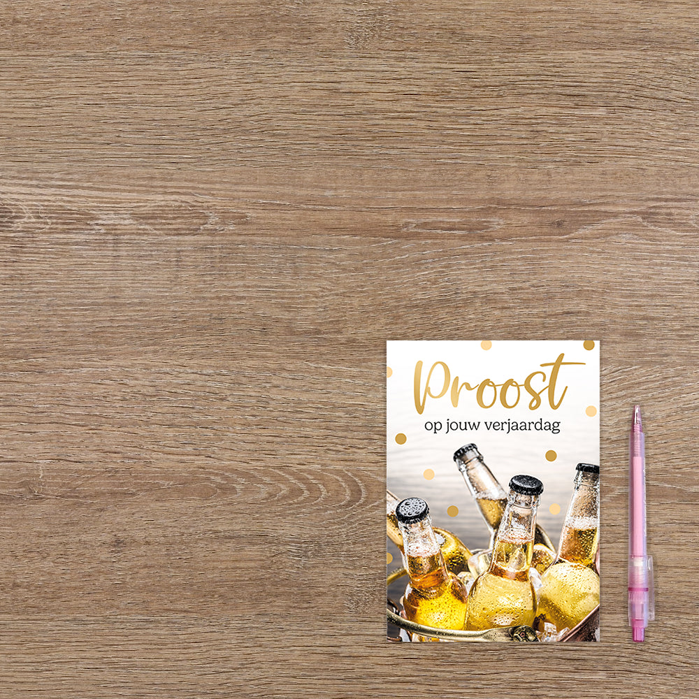 De wenskaart heeft een afmeting van x en een staande vorm. Op deze wenskaart staat een emmer met flessen bier. Daarboven staat de tekst: "Proost op jouw verjaardag". De binnenzijde van de wenskaart is bedrukt met een ontwerp passend bij de voorzijde van de kaart en de tekst "Hartelijk gefeliciteerd".